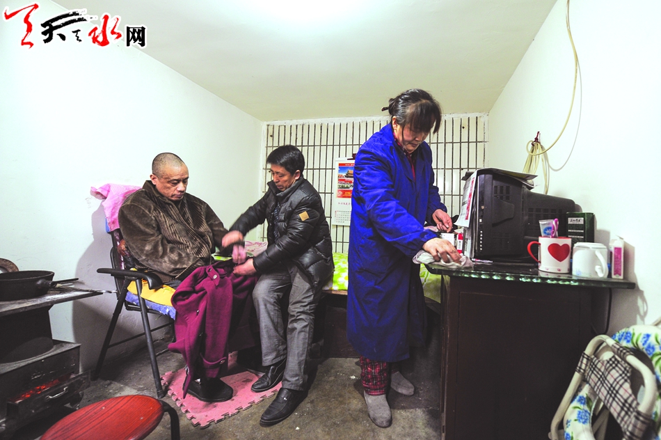 好不容易找到了朱召梅,是在秦州區(qū)重新街小區(qū)的一間車棚里。不到6平方米的車棚,是她的小屋,是她和再婚丈夫及三個(gè)孩子的家。而就在隔壁的另一間小屋里,住著她已經(jīng)照顧了20年之久的前夫、癱瘓?jiān)诖驳臈顚氂瘛?/span>