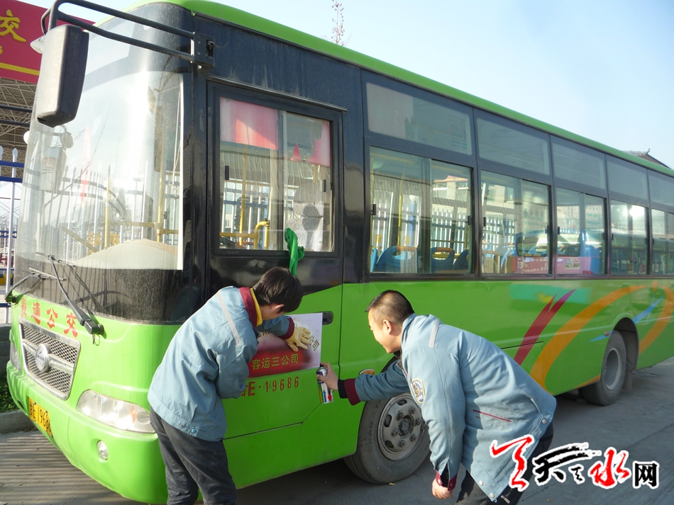 12月8日,記者來到天水羲通公交旅游集團(tuán),在天水客運(yùn)中心停車場(chǎng)看到,工作人員正在對(duì)即將上線運(yùn)營的公交車噴制門徽、張貼公交線路圖。