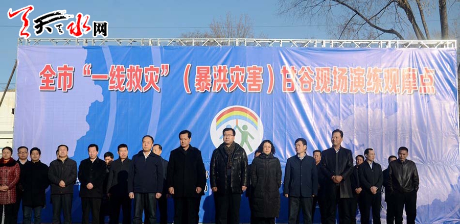 當(dāng)天,與會人員現(xiàn)場學(xué)習(xí)觀摩了在武家河鎮(zhèn)武家堡村進(jìn)行的甘谷縣“一線救災(zāi)”(暴洪災(zāi)害)現(xiàn)場演練活動。