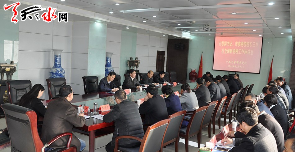 天天天水網(wǎng)訊【記者楊璟】12月15日,天水市委副書記、市委黨校校長王軍帶領(lǐng)相關(guān)部門負責人深入市委黨校調(diào)研時強調(diào),要深入貫徹落實全國、全省黨校工作會議精神,始終堅持“黨校姓黨”原則,切實發(fā)揮黨校的主陣地主渠道作用,突出黨校辦學(xué)特色,不斷創(chuàng)新培訓(xùn)理念,努力開創(chuàng)我市黨校工作新局面。