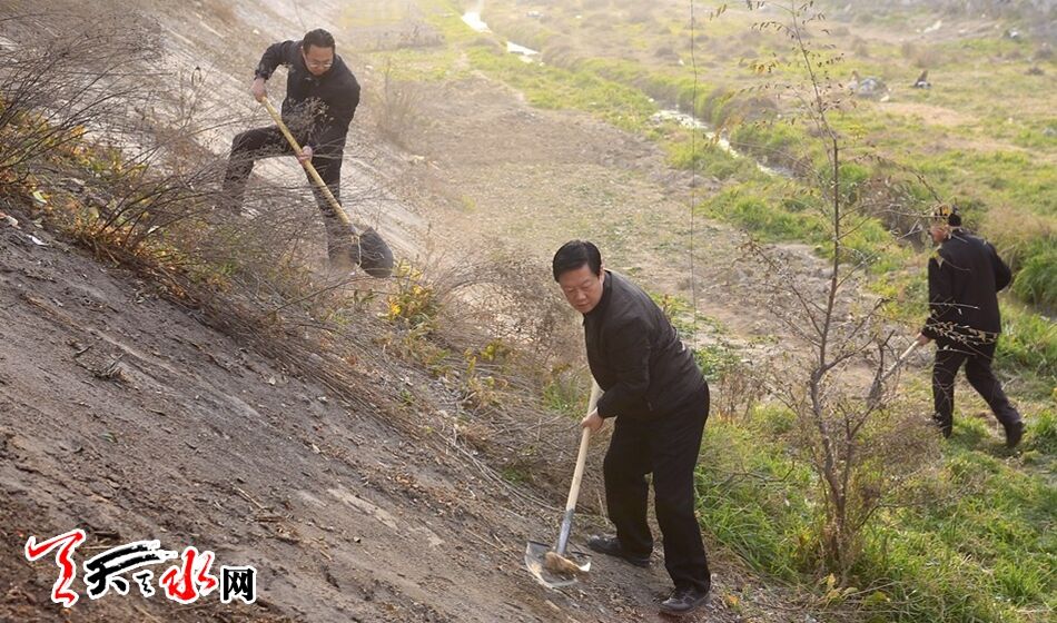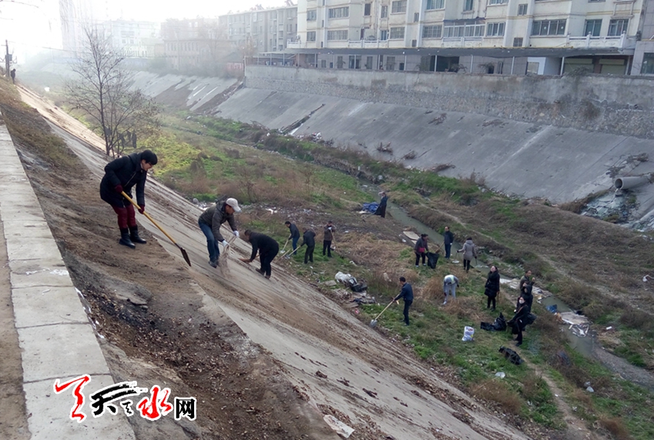 8點半左右,在秦州、麥積兩區(qū)主要路段和河道,市、區(qū)領(lǐng)導(dǎo)、機關(guān)干部和群眾早已聚集在一起。他們手持工具,認真清掃著河道兩旁的垃圾和雜草。他們?nèi)艘唤M,五人一群,有的鏟除雜草,有的打掃河道內(nèi)的垃圾,絲毫不顧揚起的灰塵,掃帚、鐵鍬齊上陣,干得熱火朝天。