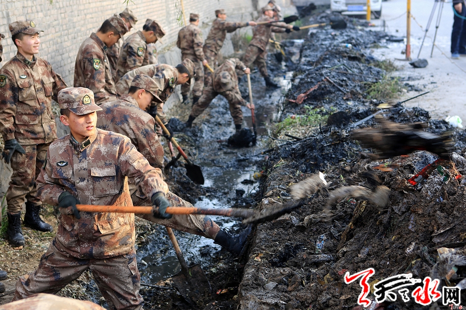 在長儀路附近的河道邊,記者看到一群身著迷彩服的戰(zhàn)士正在揮著鐵鍬清除河道內(nèi)的淤泥?!拔覄?cè)胛閯偩挖s上參加今天的衛(wèi)生清理活動,這也是一次很好的社會實踐活動,為人民服務(wù)是我們的宗旨,幫老鄉(xiāng)干活我們很是高興?!睕]說幾句,駐市某部士兵蘇帆就繼續(xù)和戰(zhàn)友們一起清理河道內(nèi)的垃圾和淤泥。