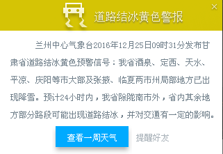 蘭州中心氣象臺(tái)2016年12月25日9時(shí)31分發(fā)布甘肅道路結(jié)冰黃色預(yù)警信號(hào):我省酒泉、定西、天水、平?jīng)?、慶陽(yáng)等市大部分及張掖、臨夏兩市州局部地方已出現(xiàn)降雪。預(yù)計(jì)24小時(shí)內(nèi),我省除隴南市外省內(nèi)其余地方部分路段可能出現(xiàn)道路結(jié)冰,并對(duì)交通有一定的影響。