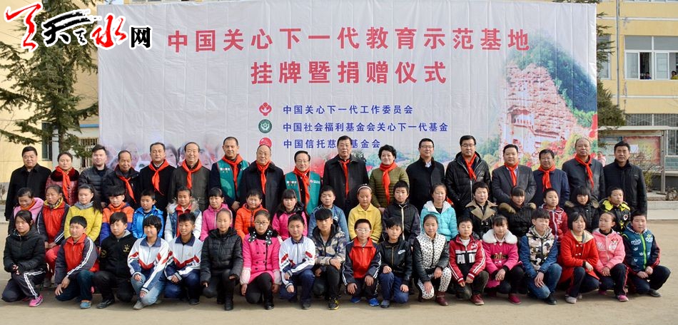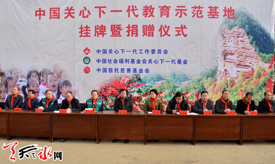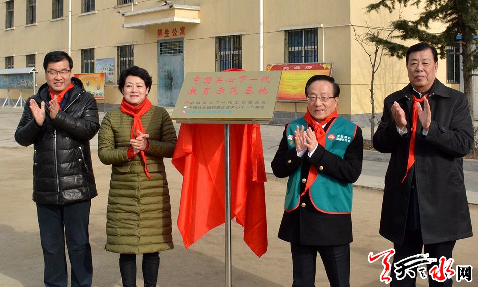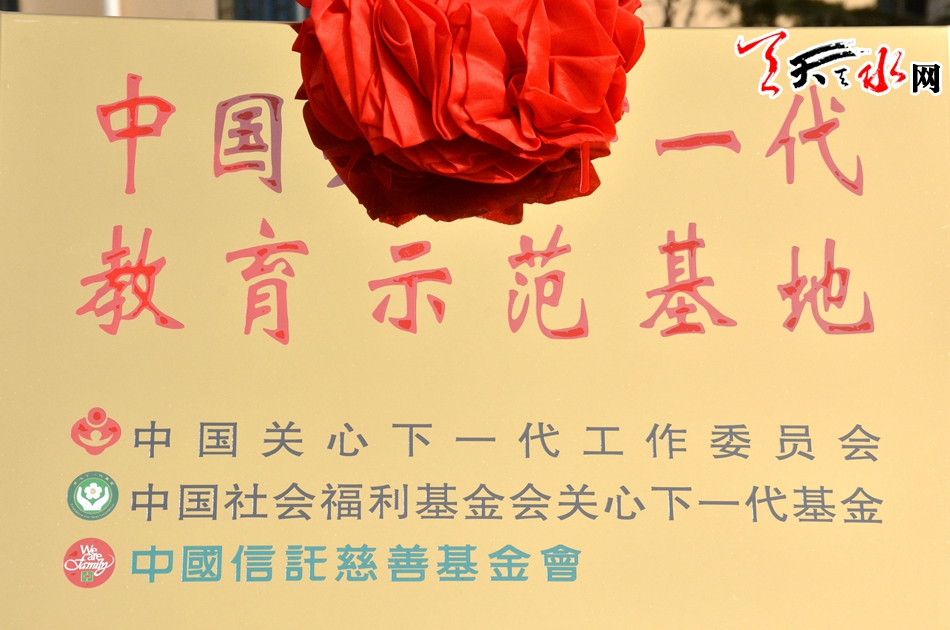 中國關工委常務副主任、中國社會福利基金會關心下一代基金理事長武韜,財團法人中國信托慈善基金會董事黃志宜,甘肅省委老干部局副局長、省關工委副主任吳萍,天水市委常委、組織部長王正茂為中國關心下一代教育示范基地揭牌。 天水市關工委主任李世榮主持掛牌儀式。