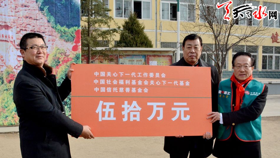 掛牌儀式上,武韜、黃志宜代表中國關工委、中國社會福利基金會關心下一代基金、中國信托慈善基金會向甘泉中學捐贈了50萬元。