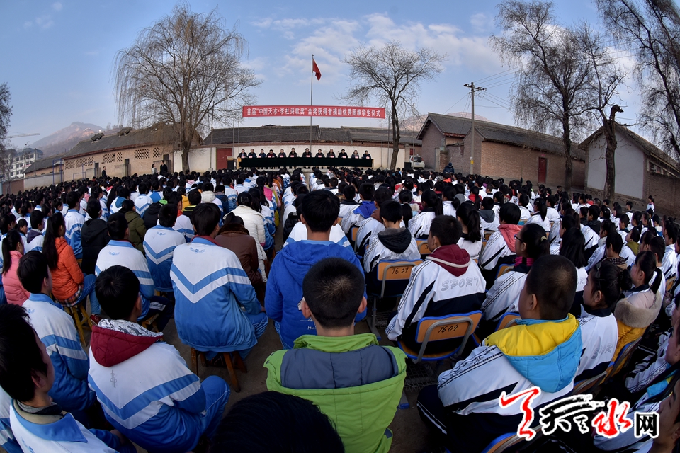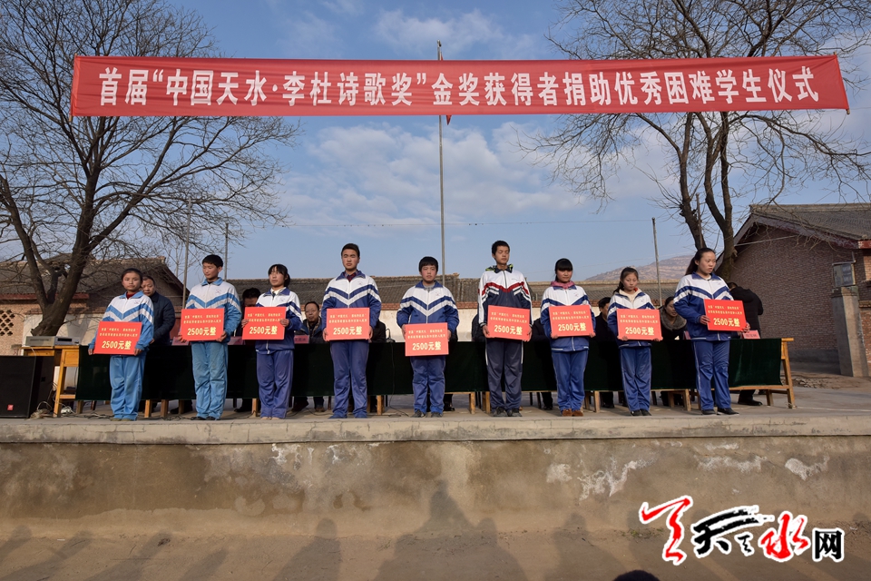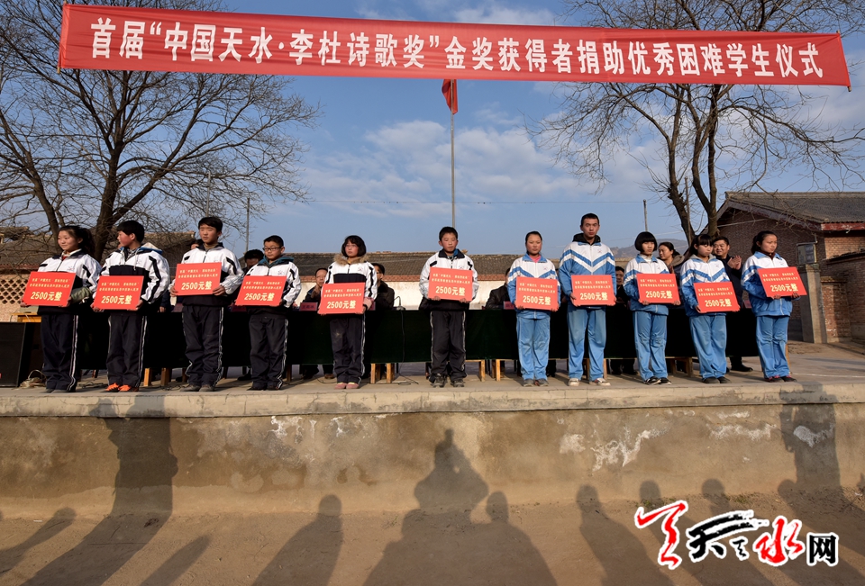????接到吉狄馬加先生的委托后,市委宣傳部和天水日?qǐng)?bào)社經(jīng)過(guò)反復(fù)選擇,并征得吉狄馬加先生同意,決定將5萬(wàn)元獎(jiǎng)金,捐獻(xiàn)給地處東柯谷(街子)這個(gè)杜甫從長(zhǎng)安來(lái)到天水后的第 一站落腳地的麥積區(qū)街子初中。