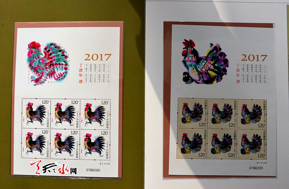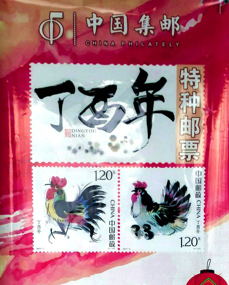 據(jù)了解,每年1月5日為生肖郵票首發(fā)式。《丁酉年》生肖郵票將“國”和“家”的概念作為整套郵票的創(chuàng)作理念。郵票第一圖畫表現(xiàn)一只奮進(jìn)奔跑的公雞形象,象征國家的快速發(fā)展,寓意“國”之概念。第二圖畫內(nèi)容表現(xiàn)母雞帶小雞的場景,象征家庭幸福美滿。該套郵票色彩鮮明、線條流暢、形象傳神、極具美感,整個設(shè)計(jì)將生肖雞的形態(tài)神韻與深厚的家國情懷完美融合在一起,兼具藝術(shù)性與內(nèi)涵性,堪稱經(jīng)典。
