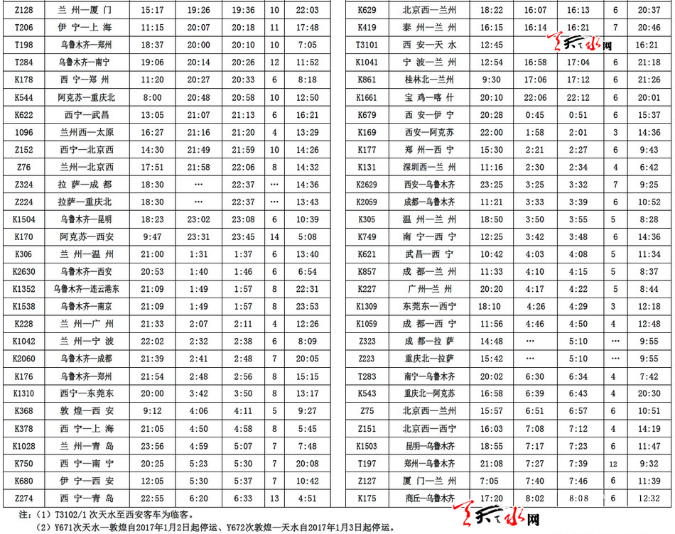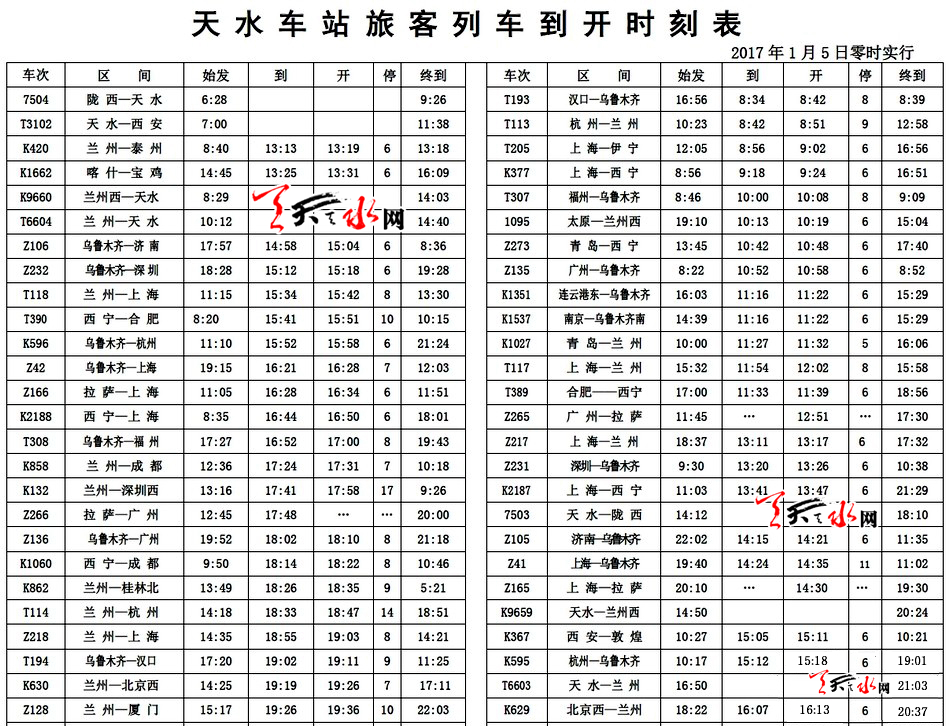 天天天水網(wǎng)訊【記者甄娜】從2017年1月5日起,鐵路實(shí)行新的列車運(yùn)行圖,調(diào)圖后,途經(jīng)天水火車站的部分列車又有了新調(diào)整。