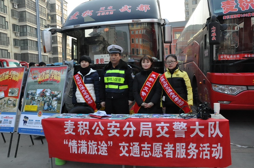 麥積公安分局交警大隊(duì)在天嘉集團(tuán)麥積汽車站組織動(dòng)員轄區(qū)青年志愿者,開展“情滿旅途”暖冬行動(dòng)交通志愿者春運(yùn)服務(wù)宣傳活動(dòng)。志愿者向群眾提供引導(dǎo)咨詢、秩序維護(hù)、重點(diǎn)幫扶、便民利民和應(yīng)急救援五個(gè)方面的宣傳服務(wù),營造平安出行、溫暖同行的良好交通出行環(huán)境。