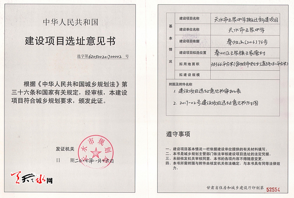 ??? 天天天水網(wǎng)訊 近日,天水市規(guī)劃局公布天水市玉泉中學搬遷新建項目信息。公告顯示,天水市玉泉中學新址位于秦州區(qū)玉泉鎮(zhèn)王家磨村,擬用地面積38366平方米。