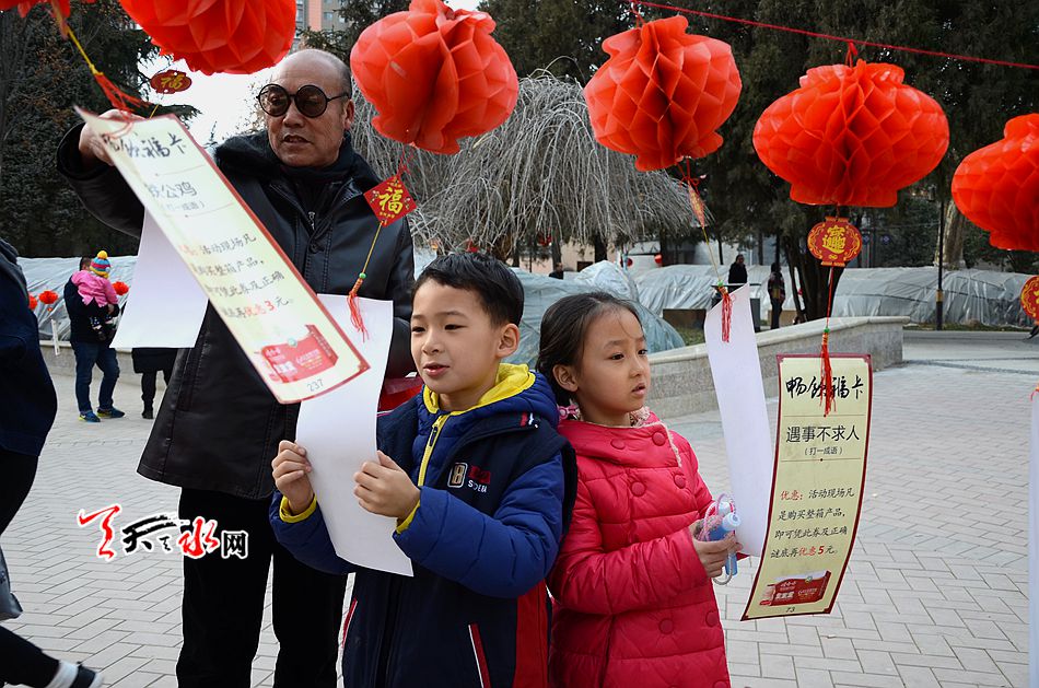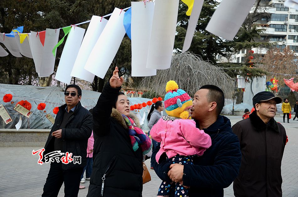 紅紅火火過雞年,熱熱鬧鬧猜燈謎。市民興趣盎然地漫步在充盈著幾分祥瑞氣氛的公園,歡聲笑語不絕于耳,大人小孩站在懸掛著燈謎的字條前,神情專注地注視著,或沉思冥想,或商討交流,不時有人會欣喜地大喊:“我猜出來了!”猜對字謎的市民喜笑顏開,倘佯在饒有興趣的字謎競猜的喜悅中?;顒蝇F(xiàn)場熱鬧非凡,上到八旬的老人,還是稚氣未脫的孩子,都踴躍參與到猜燈謎的活動中。