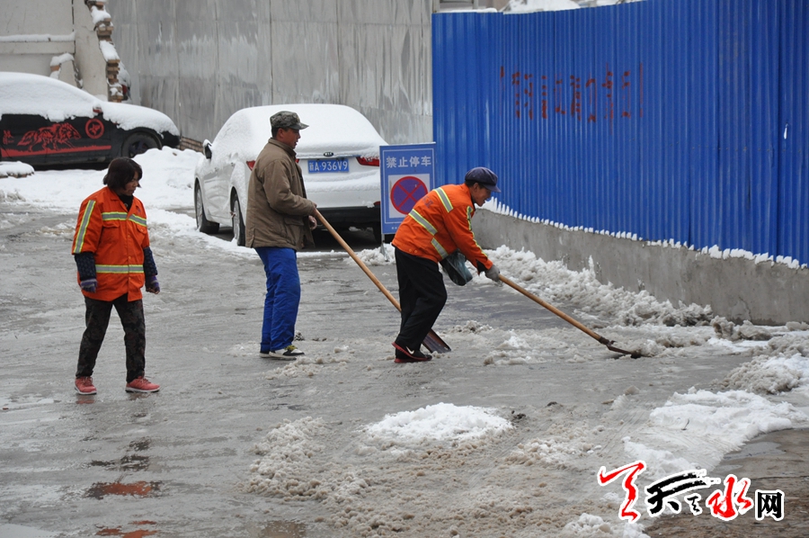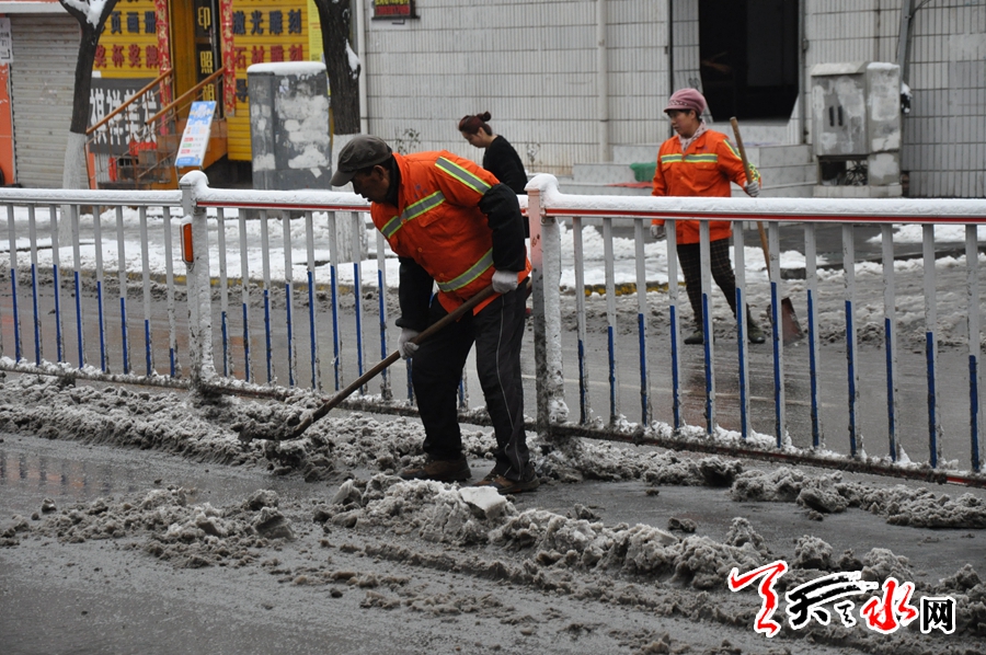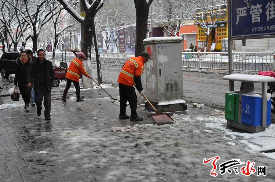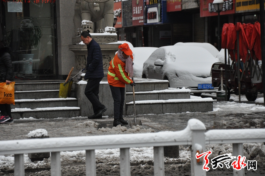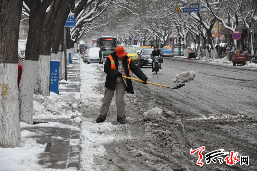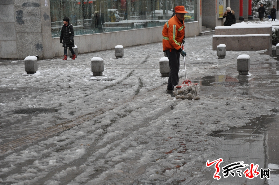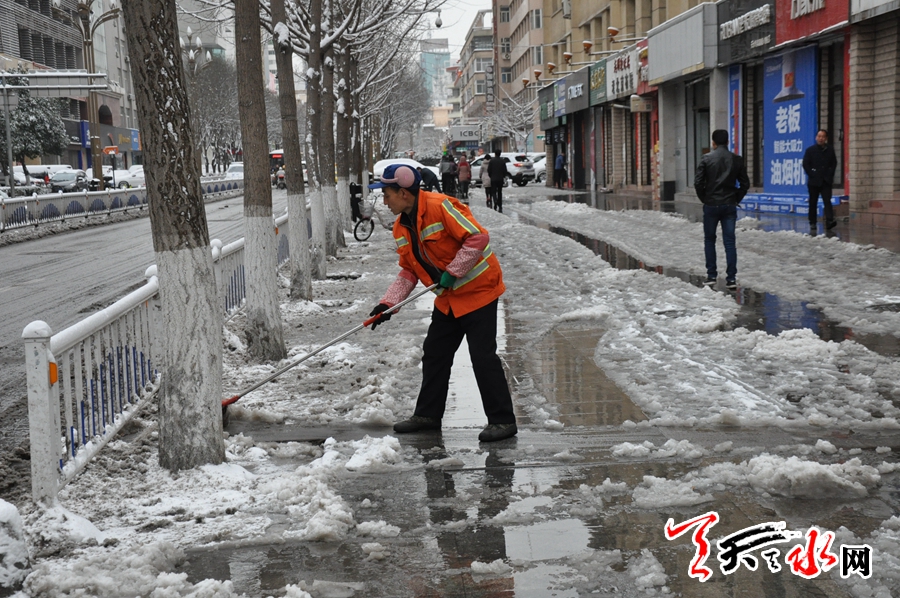 天天天水網訊(記者 劉曉亞 通訊員 王志成)昨天夜里到今日凌晨,天水普降瑞雪,這是2017年的首場降雪,此次降雪對改善土壤墑情、降低森林火險氣象等級、凈化空氣等十分有利,雪是好雪,就是為難了環(huán)衛(wèi)人。