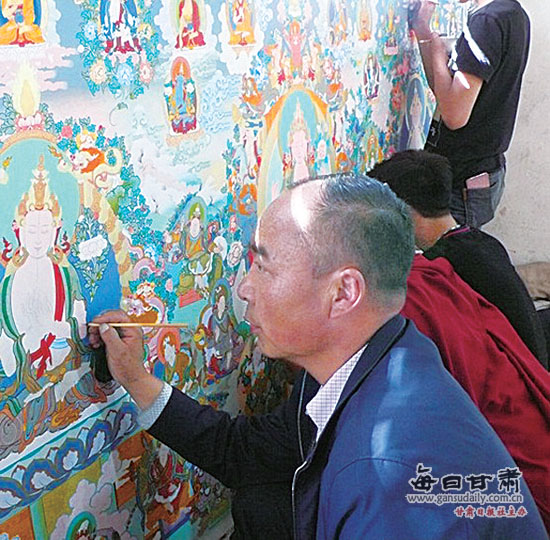 ????2.交巴加布,男,49歲,甘南藏族唐卡省級(jí)傳承人。他先后師承父親九麥(甘南藏族唐卡國(guó)家級(jí)傳承人,甘肅省工藝美術(shù)大師)和拉卜楞寺著名畫(huà)師齊智合。他在唐卡著色、暈染、勾線、上色方面都有極深的造詣,畫(huà)風(fēng)細(xì)膩,人物形象栩栩如生。2010年8月,他的作品《十八羅漢渡水圖》獲第三屆青海國(guó)際唐卡藝術(shù)與文化遺產(chǎn)暨熱貢唐卡(世界非物質(zhì)文化遺產(chǎn))博覽會(huì)組委會(huì)頒發(fā)的三等獎(jiǎng);2015年9月,紅卡帶彩文殊菩薩三尊佛在第五屆中國(guó)成都國(guó)際非物質(zhì)文化遺產(chǎn)節(jié)評(píng)展中獲一等獎(jiǎng);2015年10月,唐卡藥師佛極樂(lè)世界在第七屆(浙江)非物質(zhì)文化遺產(chǎn)博覽會(huì)評(píng)展中獲金獎(jiǎng)。2014年,他榮獲“甘肅省唐卡工藝美術(shù)師”稱號(hào)。