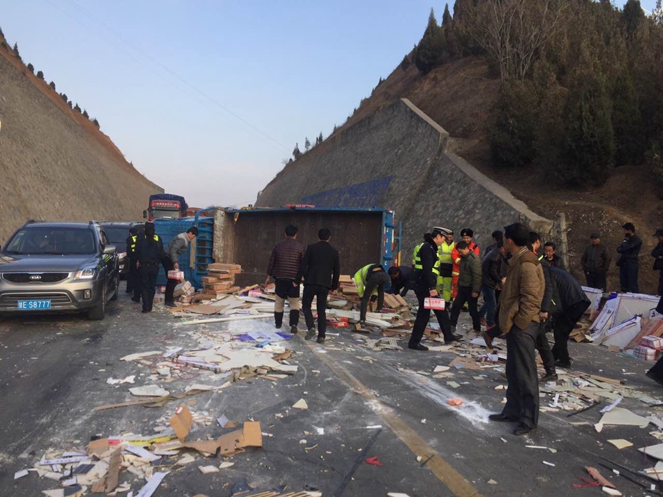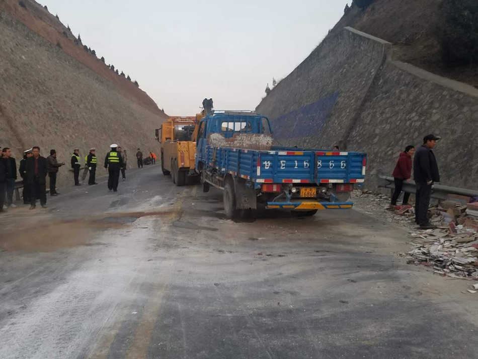 天天天水網(wǎng)訊【記者張超】2月27日下午17時,天巉公路天水向蘭州方向青寧村附近發(fā)生一起車禍,一輛載 滿瓷磚的小貨車在下坡時遇到急彎路段,而對面正好駛來一輛大貨車,小貨車駕駛員緊急躲閃,但仍擦 到大貨車的側(cè)面,導(dǎo)致小貨車側(cè)翻,瓷磚和建筑材料灑落一地,天巉公路也臨時封閉。