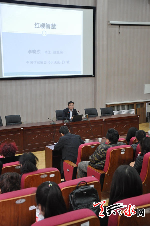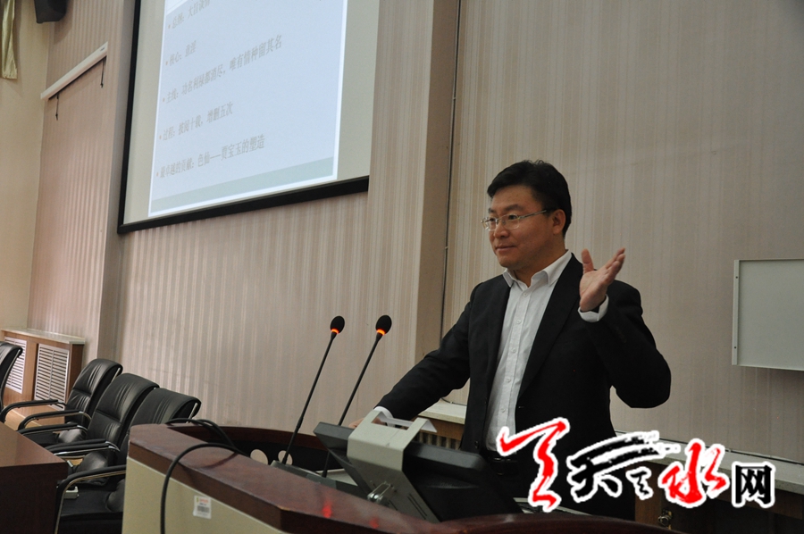 ??? 講座特邀請中國作協(xié)《小說月刊》雜志社副主編、文學(xué)博士、中共天水市委常委、副市長李曉東為全市文學(xué)作家、?文學(xué)愛好者和天水師范學(xué)院文學(xué)與文化傳播學(xué)院的學(xué)子們做了《紅樓智慧》的主題講座。講座由市文聯(lián)主席王進(jìn)文主持。