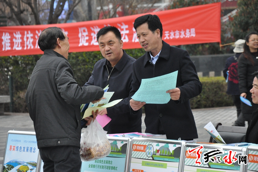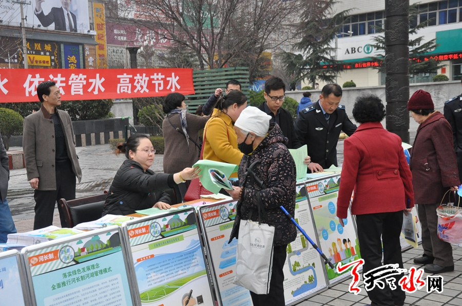 為進(jìn)一步加強(qiáng)天水市水利宣傳力度,營造良好的水利發(fā)展環(huán)境,全面貫徹落實(shí)全省水利局長會議安排部署,以保護(hù)水資源、防治水污染、改善水環(huán)境、修復(fù)水生態(tài)、加強(qiáng)水政執(zhí)法為主要任務(wù),落實(shí)綠色發(fā)展理念、全面推行河長制,持續(xù)深化水生態(tài)文明建設(shè),依法行政、依法治水,進(jìn)一步營造珍惜水資源的法治環(huán)境,為“維護(hù)河湖健康生命”奠定堅(jiān)實(shí)基礎(chǔ)。天水市在“世界水日” “中國水周”期間舉行了《中華人民共和國水法》宣傳活動。天水市水務(wù)部門主要宣傳了《中華人民共和國水法》、《中華人民共和國防洪法》、《中華人民共和國水土保持法》等水法律法規(guī),天水市市情水情、水利改革發(fā)展成效、水利法治建設(shè)成果以及我國河長制產(chǎn)生的時代背景、主要內(nèi)涵以及推行河長制的重大現(xiàn)實(shí)意義與深遠(yuǎn)歷史影響。