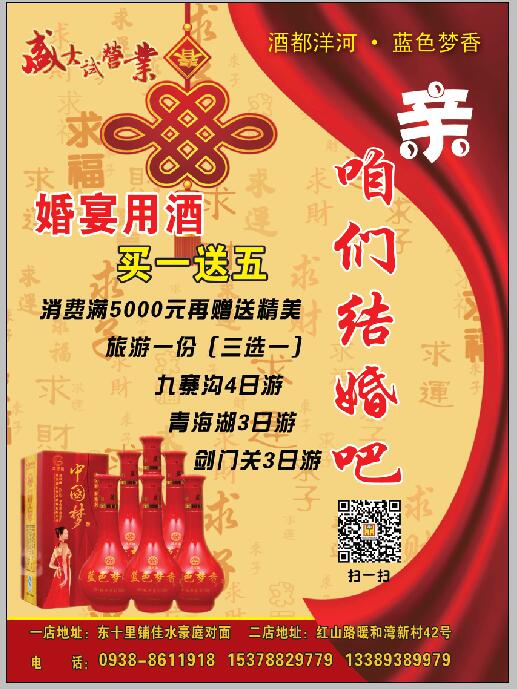 婚宴用酒買一送五,消費滿5000元再贈送精選旅游一份(三選一):