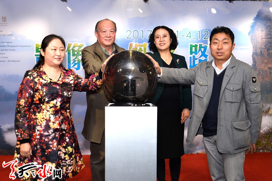 (中國攝影家協(xié)會副主席鄧維,甘肅省攝影家協(xié)會駐會副主席杜芳,天水市副市長王燕共同啟動展覽開幕球。)