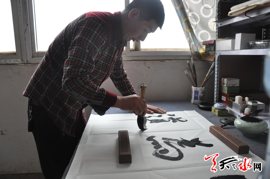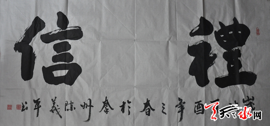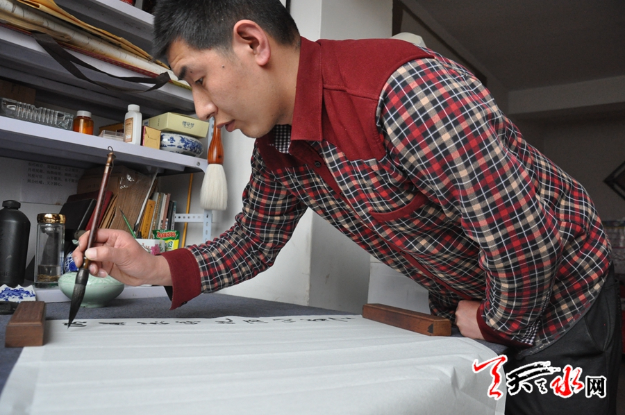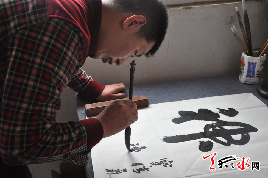 上世紀(jì)八十年代中期,陳義軍出生在隴南市禮縣雷王鄉(xiāng)的一個(gè)叫陽(yáng)坡的小村子,在他上小學(xué)時(shí),就對(duì)寫字十分鐘愛,在別的孩子對(duì)漢字基本筆畫感到枯燥乏味之時(shí),他卻在點(diǎn)畫撇折間找到了莫大的樂(lè)趣,每每空閑,他就對(duì)照課本上“田字格”里印刷的生字的間架結(jié)構(gòu)、章法布局進(jìn)行練習(xí),不知不覺間幾年過(guò)去,經(jīng)過(guò)幾年的不輟練習(xí),小學(xué)畢業(yè)時(shí),陳義軍的漢字書寫取得不小的進(jìn)步,他已經(jīng)能寫出一筆漂亮的字,不論硬筆字還是毛筆字。