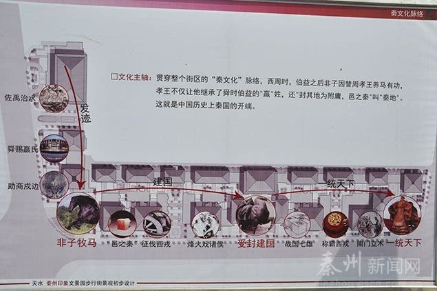 文化主軸 以歷史發(fā)展的時間順序為主線,在商業(yè)步行街主要入口雕塑“非子牧馬、舜賜贏氏、受封建國、征伐西戎、烽火戲諸侯、戰(zhàn)國七雄、南門立木、一統(tǒng)天下”,再現(xiàn)一個個鮮明的先秦故事,提高了步行街的文化品位。