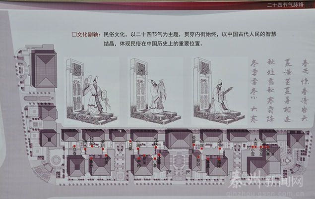 文化副軸二 主要體現(xiàn)民俗文化,以二十四節(jié)氣為主題,貫穿文景園步行街內(nèi)街始終。主要通過鋪裝、浮雕、雕塑、綠化等方式打造景觀小品,形象體現(xiàn)立春、雨水、驚蟄、春風(fēng)、清明、立夏、立秋、立冬等二十四節(jié)氣,讓游客對中國獨有的農(nóng)記立法得以直觀形象的認(rèn)識。