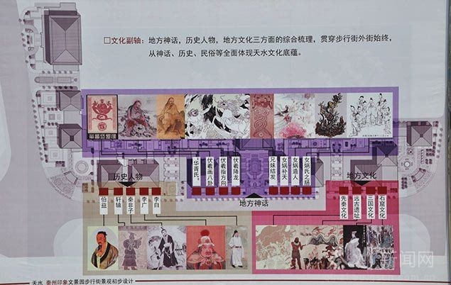 文化副軸一 主要在步行街外景體現(xiàn)天水的文化底蘊。主要以雕塑、浮雕、鋪裝等方式為載體,展現(xiàn)伯益、軒轅、秦非子、李廣、李白等歷史人物,伏羲畫八卦、女媧補天等地方神話,遠(yuǎn)古遺址、三國文化、石窟文化等地方文化,從神話、歷史、民俗等方面全面體現(xiàn)天水悠久的文化底蘊。