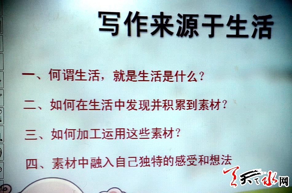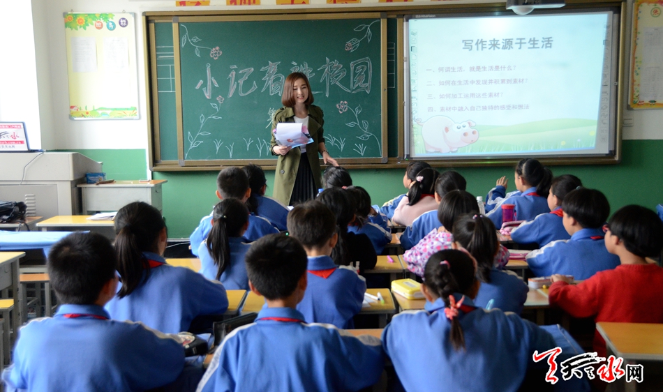 小記者進校園活動,是天水日報社策劃的小記者系列活動之一。小記者進校園第一站,由我社記者朱君芳主講,以《寫作來源于生活》為主題,圍繞何謂生活,生活是什么?如何在生活中發(fā)現(xiàn)并積累到素材?如何加工運用這些素材?素材中融入自己獨特的感受和想法四個方面進行了講解。