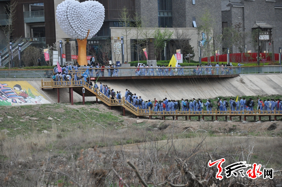 迎著初升的陽(yáng)光,在獵獵隊(duì)旗的指引下,由學(xué)生和帶隊(duì)老師組成的隊(duì)伍浩浩蕩蕩作出校門(mén),走向自然,走向農(nóng)村,走向他們的未來(lái)。此次研學(xué)旅行孩子們將沿著三中--西大橋--佳?水岸小鎮(zhèn)--趙家崖--師家崖--靳家崖--鄭家磨--川口小學(xué)全長(zhǎng)11.2公里的線(xiàn)路向西行進(jìn)。走出校門(mén),走進(jìn)大自然的孩子們顯得無(wú)比興奮,隊(duì)伍行進(jìn)整齊有序,在城區(qū)段孩子們表現(xiàn)如常,可是當(dāng)隊(duì)伍進(jìn)入師家崖,當(dāng)孩子們走過(guò)花朵怒放的果園,走過(guò)油菜花田時(shí),孩子那種好奇、天真的本性得到了充分的釋放,“快看!那是什么花?”“那是梨花!”“不對(duì),不對(duì),那是蘋(píng)果花!”“不對(duì),那是櫻桃花!”一場(chǎng)關(guān)于花的爭(zhēng)辯開(kāi)始了,男孩女孩大聲爭(zhēng)論著,嘰嘰喳喳,笑聲,喊聲,爭(zhēng)論聲連成一片,“同學(xué)們,剛才你們看到的白里帶紅的花是蘋(píng)果花,一簇一簇的白花是櫻桃花,”帶隊(duì)老師在學(xué)生爭(zhēng)論不休的時(shí)候大聲告訴孩子們正確答案,又引來(lái)一陣歡笑。