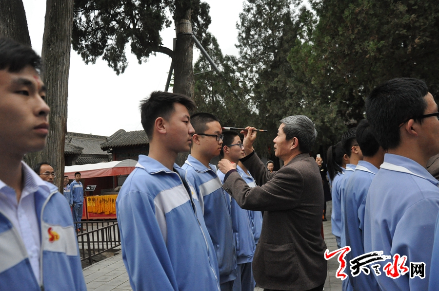 天水市博物館館長(zhǎng)李寧民在市三中的邀請(qǐng)下,給參加成人儀式的學(xué)生們額頭點(diǎn)上朱砂,為他們啟智,猩紅的朱砂,親切的祝愿,把老一輩的期盼、祝福和囑托交付給未來(lái)的主人。