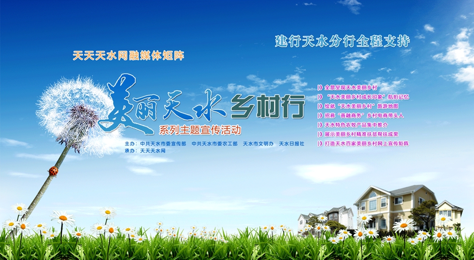 由天水市委宣傳部、天水市委農工部、天水市文明辦、天水日報社聯(lián)合開展的“美麗天水鄉(xiāng)村行”大型主題采訪活動,圍繞社會主義新農村建設的總體要求,以美麗天水秀美鄉(xiāng)村為焦點,集中展示十二五期間天水新農村建設新成就,本次活動由中國建設銀行天水分行全程鼎力支持。