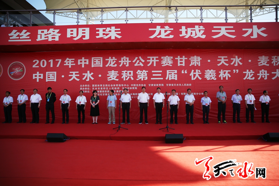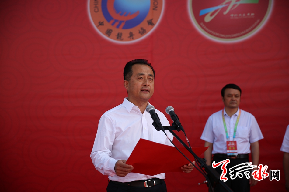 王軍在致辭中說,天水作為國家歷史文化名城、中國優(yōu)秀旅游城市、關(guān)中——天水經(jīng)濟區(qū)次核心城市和絲綢之路經(jīng)濟帶重要節(jié)點城市。近年來,天水市充分依托文化旅游資源優(yōu)勢和良好的群眾體育基礎(chǔ),廣泛開展群眾體育運動,積極打造精品體育賽事,先后成功舉辦了一系列重大體育賽事活動,有力促進了全市體育事業(yè)和文化旅游的深度融合發(fā)展。中國龍舟公開賽(甘肅·天水·麥積站)作為國內(nèi)頂級龍舟賽事,已在天水成功舉辦三屆,對于弘揚中華民族優(yōu)秀傳統(tǒng)文化、豐富群眾體育文化生活、提升天水對外知名度和影響力,加快建設(shè)“絲綢之路經(jīng)濟帶”宜居宜業(yè)宜游歷史文化名城具有十分重要的意義。