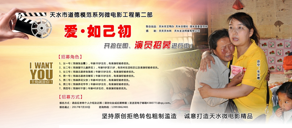 是否你也曾被道德模范們的事跡深深感染,您是否也想通過自己的切身演繹向他們致敬。那就來參與微電影《愛·如己初》的劇組演員選拔吧!我們的團隊務實嚴謹,從劇本撰寫、拍攝、后期全部堅持本土原創(chuàng),拒絕粗制濫造,拒絕轉(zhuǎn)包牟利,誠意打造天水公益微電影精品,與我們合作您一定不虛此行。