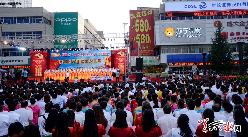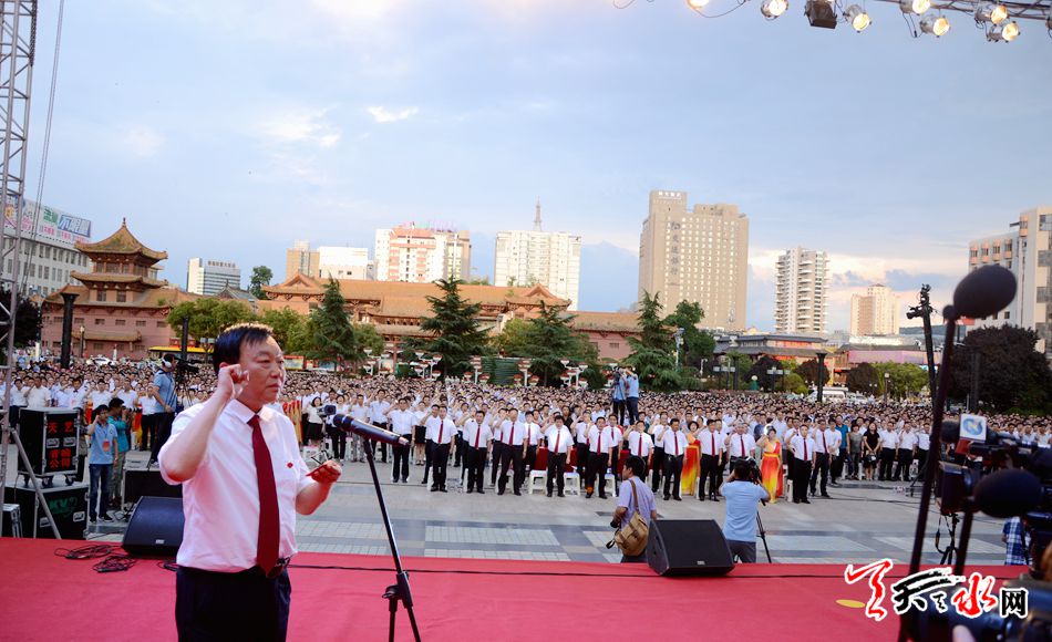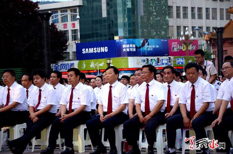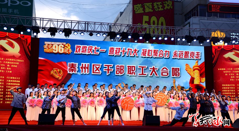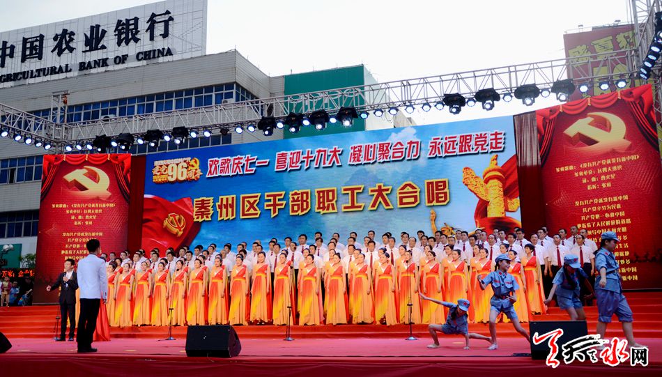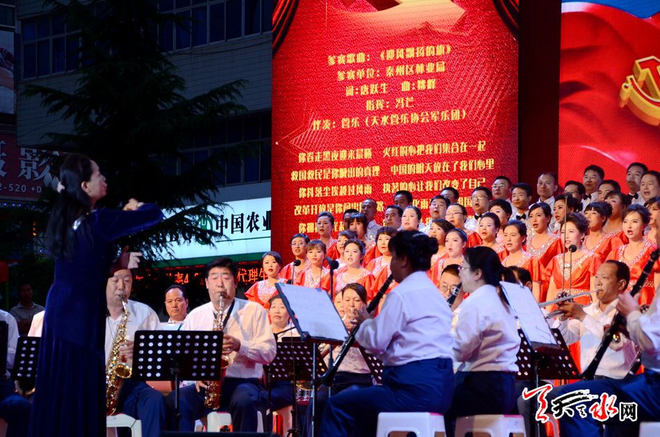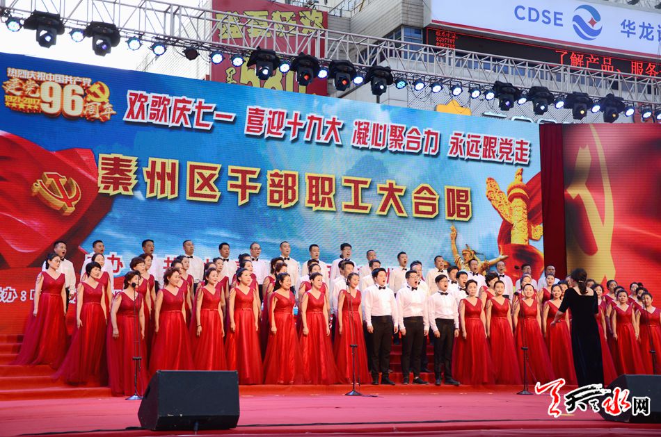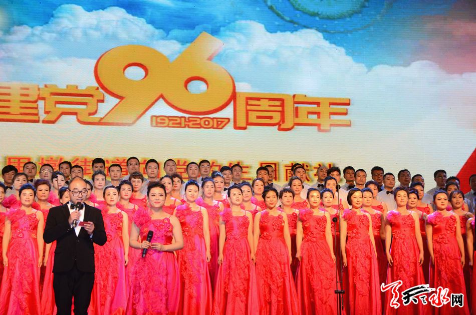天天天水網(wǎng)【記者 張文都】“南湖的船啊,黨的搖籃!歷史從這里揭開新篇,這顆照徹中國(guó)大地的巨星,從美麗的嘉興南湖升起!中國(guó)革命的航船,從這里揚(yáng)起征帆……”伴隨著主持人雄渾厚重的嗓聲,6月29日晚,一場(chǎng)以“歡歌慶七一,喜迎十九大,凝心聚力,永遠(yuǎn)跟黨走”為主題的紀(jì)念建黨96周年干部職工大合唱在天水市龍城廣場(chǎng)拉開序幕。