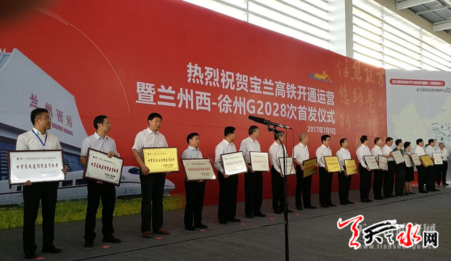 天天天水網(wǎng)訊【記者羅雙紅】7月9日,在蘭州西站舉行的祝賀寶蘭高鐵開(kāi)通運(yùn)營(yíng)暨蘭州西—徐州G2028次高鐵動(dòng)車首發(fā)儀式上,省政府對(duì)甘肅高鐵建設(shè)作出突出貢獻(xiàn)的先進(jìn)單位進(jìn)行了表彰,我市被授予“甘肅高鐵建設(shè)突出貢獻(xiàn)獎(jiǎng)”。