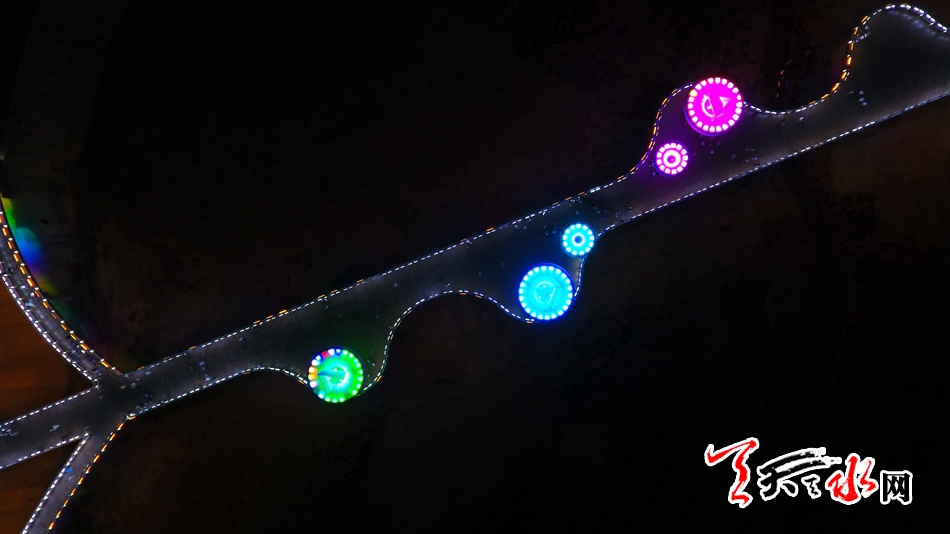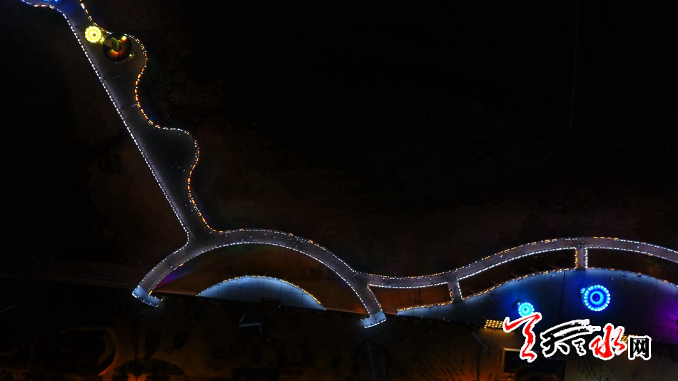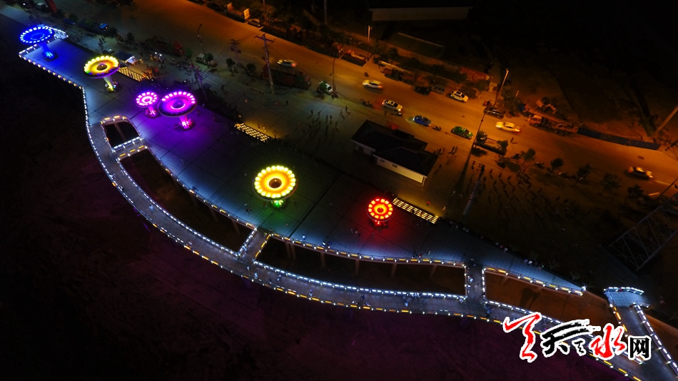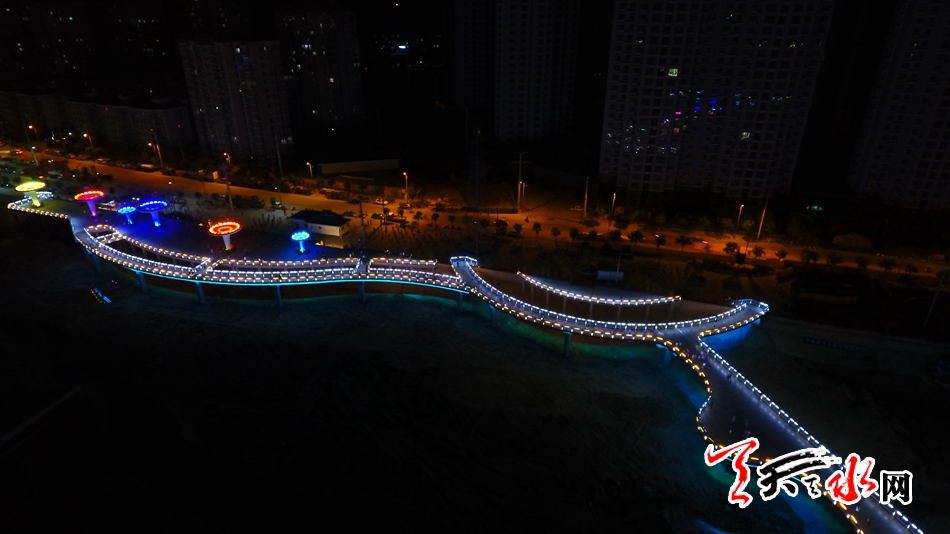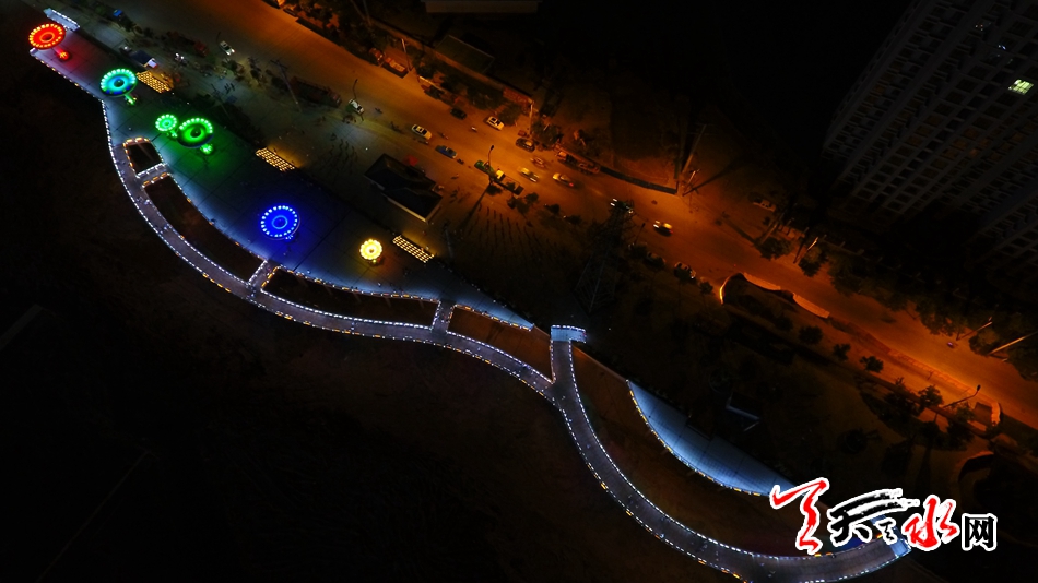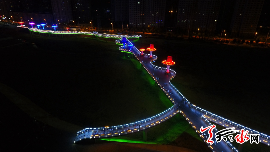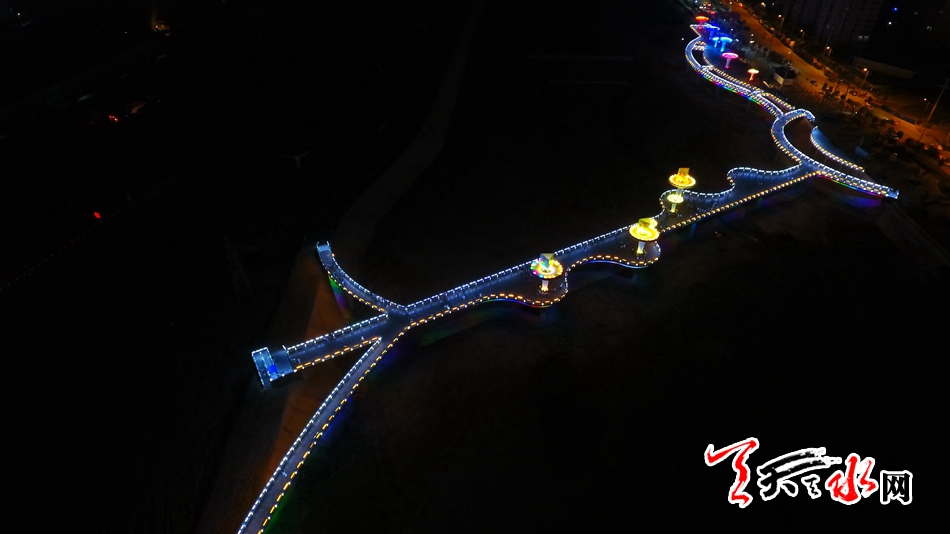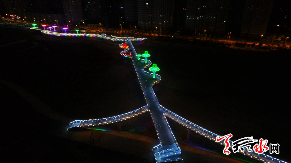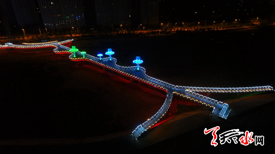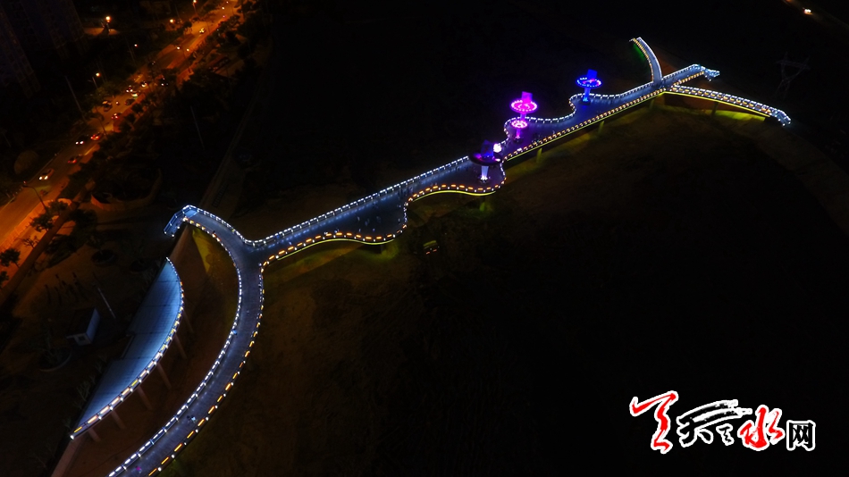 7月13日,天天天水網(wǎng)“航拍天水”采訪組對該橋進(jìn)行了航拍??罩懈╊鶚?,新穎的設(shè)計(jì)讓整座橋現(xiàn)代感十足,又不失典雅精致,夜幕降臨后,橋體通過智能控制系統(tǒng)操控多場景變換的燈光色帶,與藉河兩岸燈光夜景交相輝映,營造出舒適宜人的光環(huán)境,為夜色下的橋體增添了璀璨迷人的水光意境。