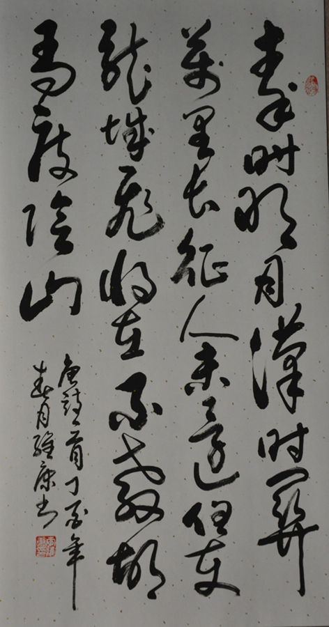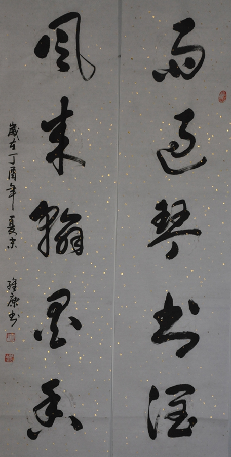 “多少年以來,我愛寫字,向很多人請教,可是有些人知道我上學(xué)少,就挖苦我說,你認(rèn)得幾個字,還要練字,這讓我心里憋了一口氣,就下定決心要把字練好,給這些人看看,一個上學(xué)不多的人也能把字寫好。后來雖然我的手傷殘了,但仍能用右手寫字,甚至還練會了用左手寫字。我之所以開畫廊,就是為了在解決生計的同時,多見識大家的字畫,在自己苦、練臨帖的同時,也得到了一些像邵凱、邵全堯等老師的指點,這是我在書法上的進(jìn)步很快,現(xiàn)在我的字有人說功底很好,就是不知出自哪家哪派,因為從過去到現(xiàn)在的一些大家的字我都學(xué),大到謀篇布局,章法結(jié)構(gòu),小到一筆一劃,落款蓋印,我都潛心學(xué)習(xí),所以我的字可以說無宗無派?!崩罹S康在他的書房里指著他的作品說?!安还苡信蓻]派,我以后都要堅持下下去,不求能夠登上大雅之堂,只求能給我們這里四嶺八鄉(xiāng)的鄉(xiāng)親們寫字,我是一個農(nóng)民,我在用沾滿泥土的手,蘸著泥土寫字,我要寫出大地的深厚和博大,要寫出田園質(zhì)樸和包容?!?/p>