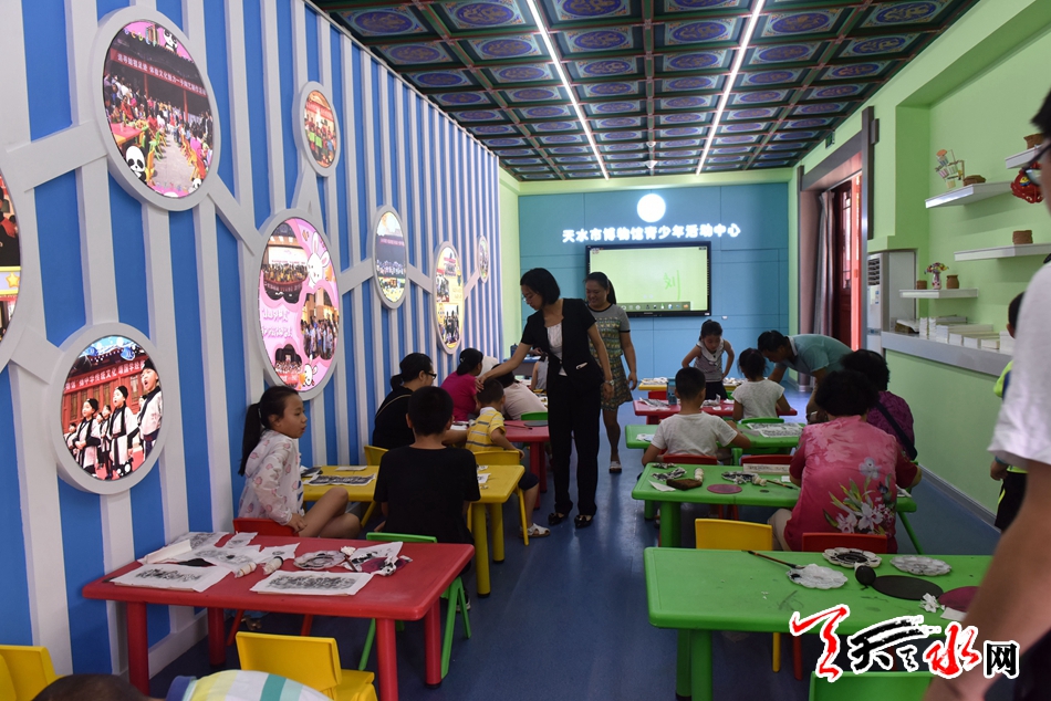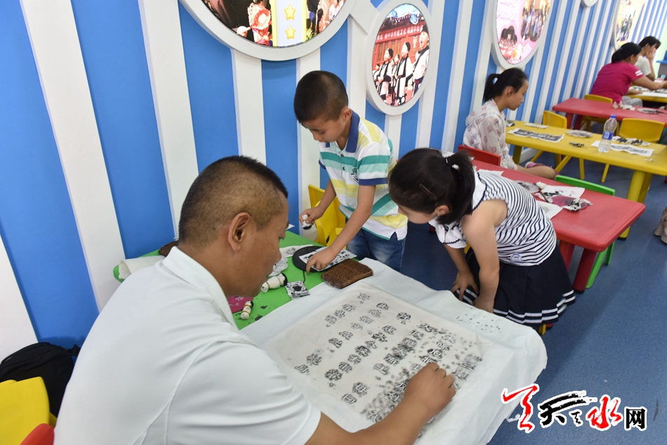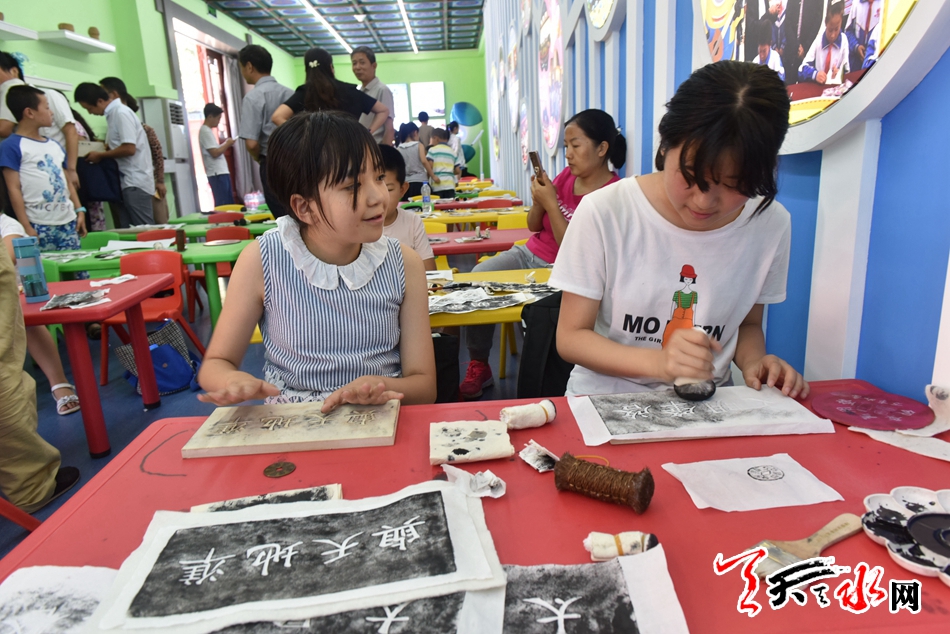 ??? 8月3日,幾位小朋友在天水市博物館青少年活動(dòng)中心一邊聽(tīng)輔導(dǎo)員講解一邊在制作拓片,感受傳統(tǒng)文化。該中心設(shè)有大量適宜少兒學(xué)習(xí)的多媒體課件、視頻和音頻播放設(shè)備,教學(xué)課桌和兩臺(tái)9DVR虛擬現(xiàn)實(shí)設(shè)備座椅,可一次性接待50名小朋友免費(fèi)學(xué)習(xí)。記者 陳娟 攝