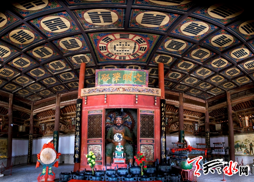 清順治十年(1653年),伏羲廟迎來了第三次大修。這次重修由時任秦州知州的姚時采主持。據(jù)康熙《秦州志?廟壇》記載,當時修建大門3間,儀門3間,先天殿7間、太極殿5間。志中寫道:“是廟也,臺殿崔嵬,棟宇宏麗,又植柏樹數(shù)十株,周以崇垣。北負天靖山,南帶藉水而揖南山,東約魯谷水,西引赤峪,實為隴西勝概,天水圣域云?!奔べp贊譽之詞,溢于言表。同治年間,伏羲廟內(nèi)的所有建筑物都改用琉璃瓦鋪設(shè)。光緒三年(1877年),秦州發(fā)生了大地震,伏羲廟損壞慘重。光緒九年(1883年),重修伏羲廟。據(jù)《重修伏羲廟記》,“重門聳矗,綽楔對峙,金碧丹艧,照耀通衢”。如今我們所能看見的伏羲廟內(nèi)的古建筑,就是重修之后的遺存。