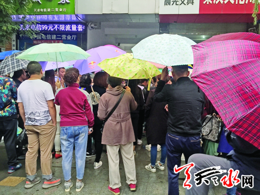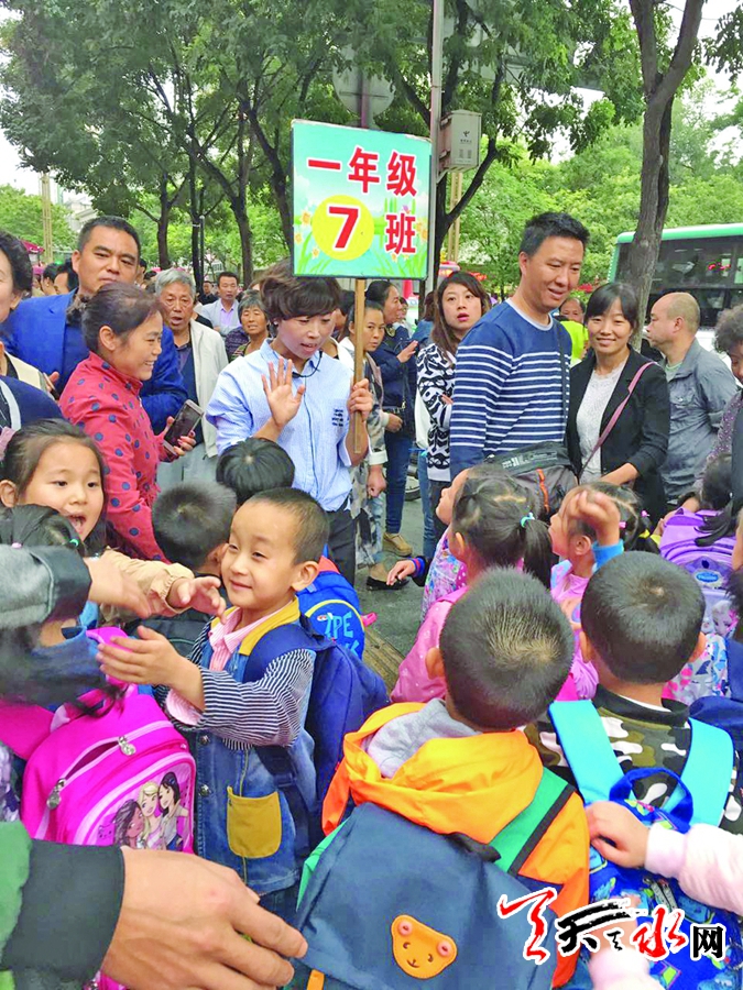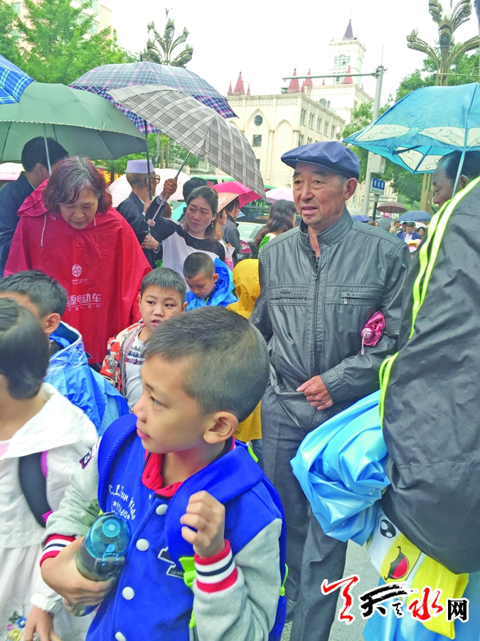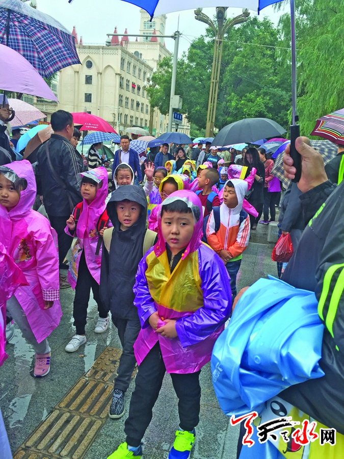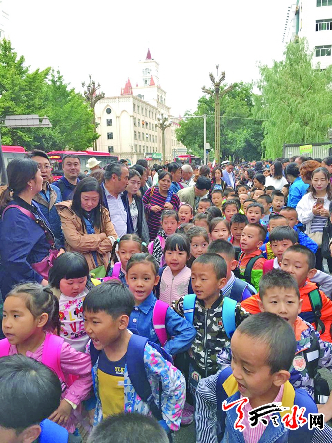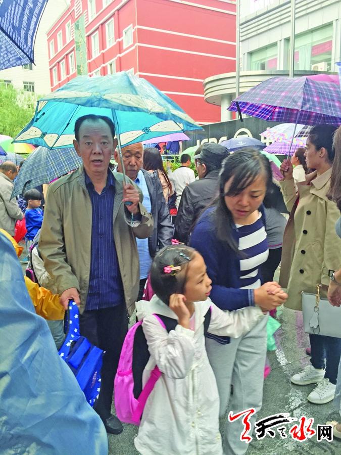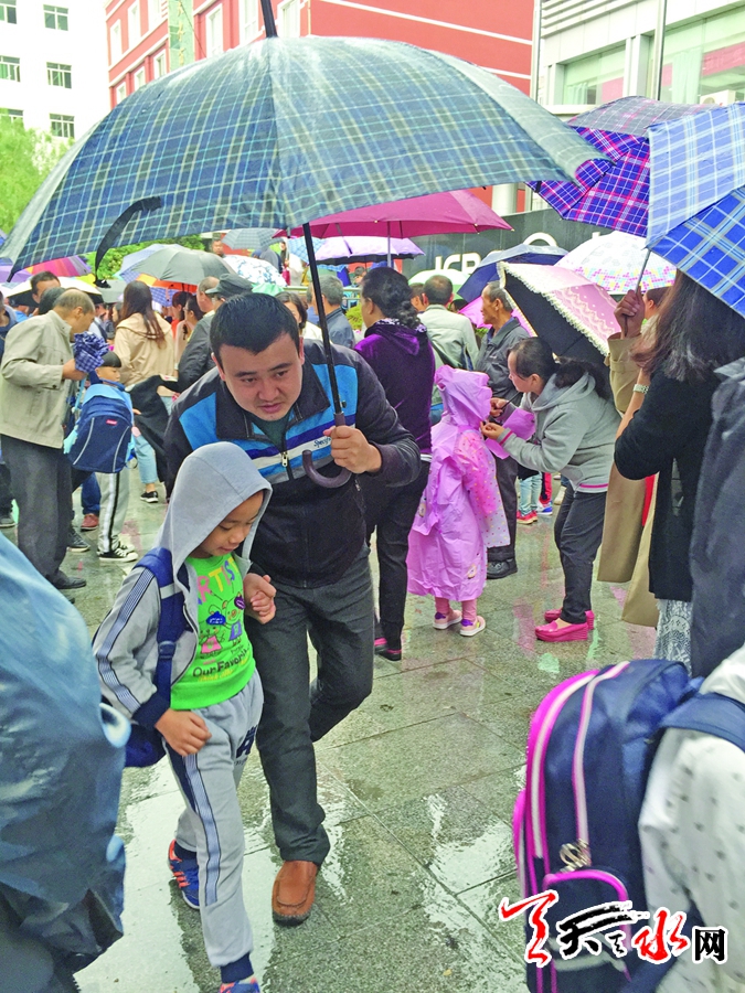 當(dāng)日中午11時(shí)10分,記者在天水建二小學(xué)門口看到,盡管下著小雨,學(xué)校門前和旁邊的街道上,還是擠滿了前來(lái)接孩子的家長(zhǎng),打著傘、穿著雨衣的家長(zhǎng)們將學(xué)校門口圍得水泄不通,只為早點(diǎn)接到自家孩子。11時(shí)20分,一年級(jí)的孩子們整整齊齊走出了校門,家長(zhǎng)趕緊圍了上去接自家的孩子,老師把孩子們一個(gè)一個(gè)交給家長(zhǎng),揮手和孩子們?cè)僖?。家長(zhǎng)們則一個(gè)個(gè)給孩子打著傘、穿著雨衣,然后才帶著孩子逐漸散去。
