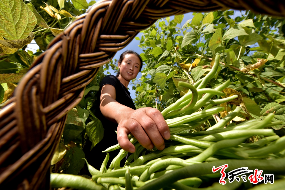 武山縣四門鎮(zhèn)松樹村村民錄應(yīng)子正在采摘“架豆王”