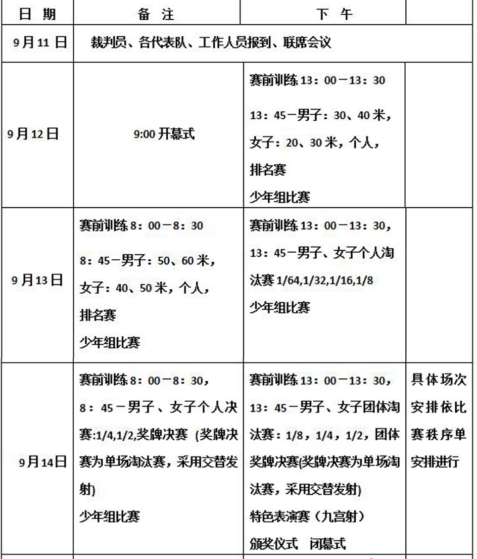 2017年中國·天水秦州第三屆“李廣杯”國際傳統(tǒng)射箭錦標(biāo)賽的主題是“弘揚(yáng)射藝文化,傳承中華文明,展示名城風(fēng)采,推動天水發(fā)展”。將有來自俄羅斯、韓國、波蘭等10支國外代表隊(duì),國內(nèi)32支代表隊(duì),以及天水12支代表隊(duì)共計(jì)54支代表隊(duì)350多名運(yùn)動員參加比賽。本次比賽設(shè)為傳統(tǒng)竹木弓組、傳統(tǒng)筋角弓組、現(xiàn)代傳統(tǒng)弓組、少年現(xiàn)代傳統(tǒng)弓組等4個(gè)競賽項(xiàng)目和1個(gè)九宮格表演項(xiàng)目,比賽將于2017年9月12日至14日在天水師范學(xué)院田徑場進(jìn)行,9月12日上午舉行開幕式。