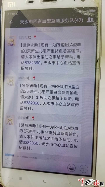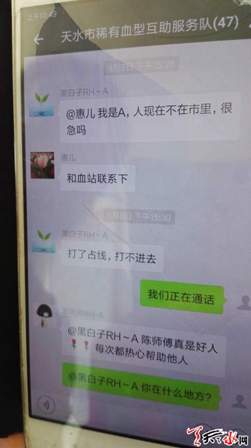 “現(xiàn)在有一位RH陰性A型血的新生兒患嚴重貧血,急需輸血,請大家伸出援助之手給予幫助!”8日下午14時55分,血站招募宣傳科科長楊磊向天水市稀有血型互助服務隊的微信群連發(fā)求助三次。隨即,在線群成員紛紛響應:“可以轉發(fā)嗎?我的是B型?!薄拔沂茿型,小孩剛滿3個月可以嗎?”“我是A型,現(xiàn)在不在市里,很急嗎?”……