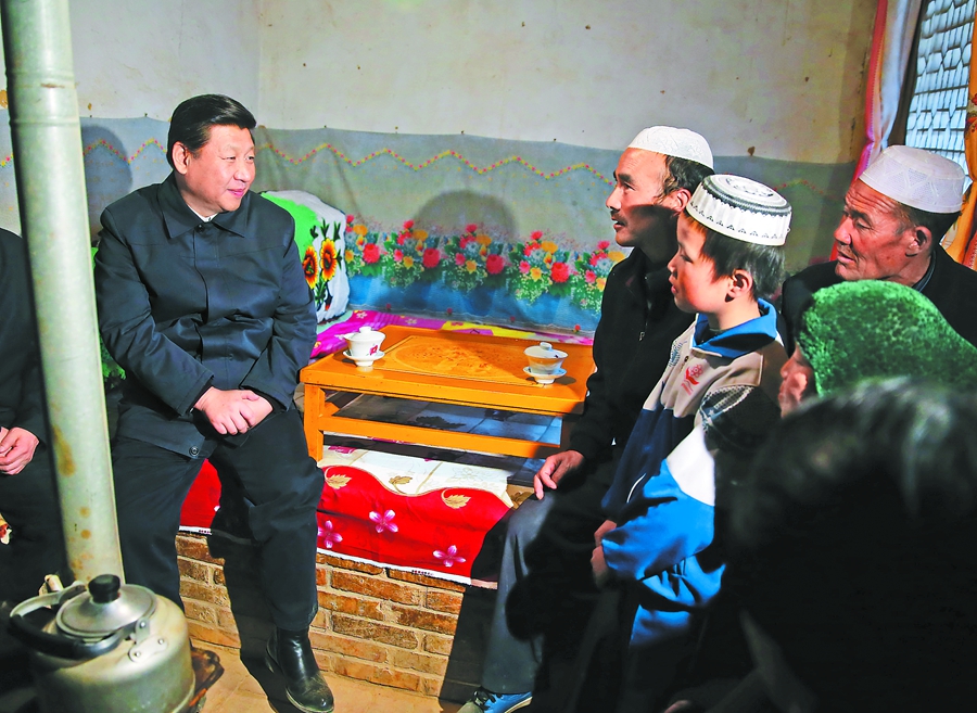 ??? 2013年2月3日,習(xí)近平總書記沿著陡峭山路來到山大溝深的臨夏回族自治州東鄉(xiāng)族自治縣布楞溝村看望東鄉(xiāng)族群眾。圖為習(xí)近平在村民馬麥志家,和一家人嘮家常。 新華社記者 蘭紅光