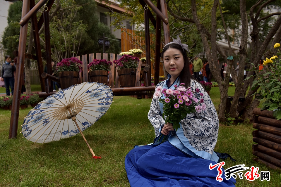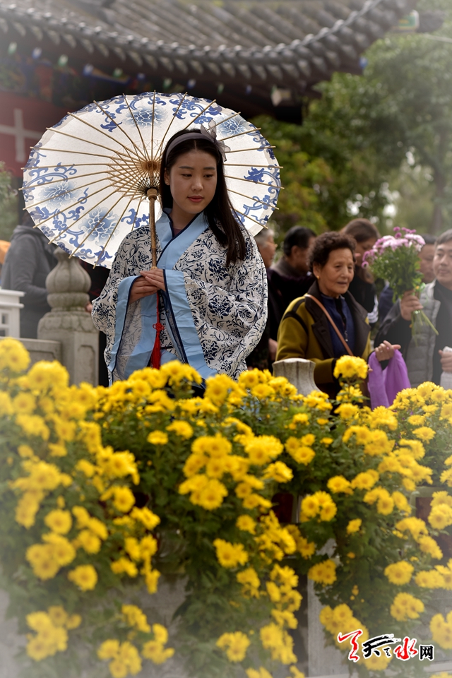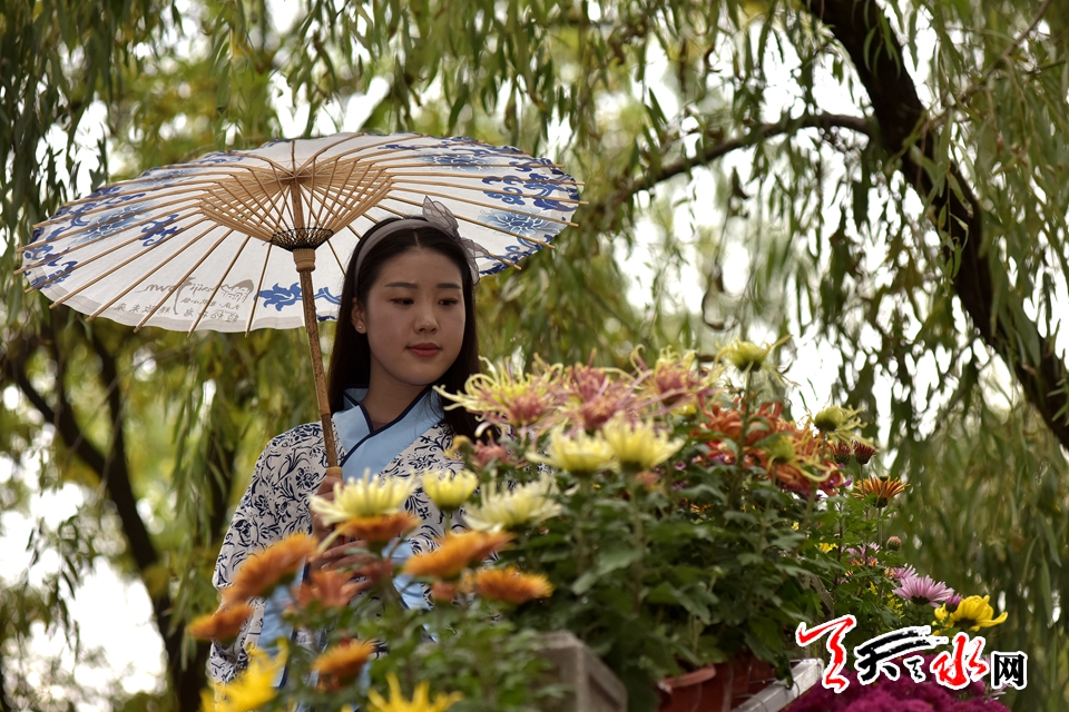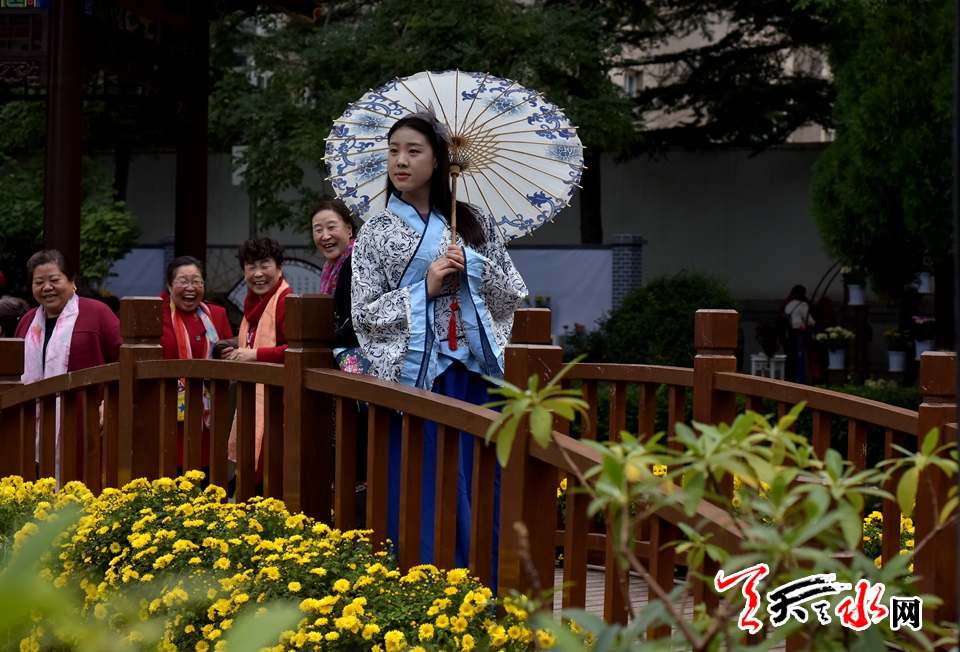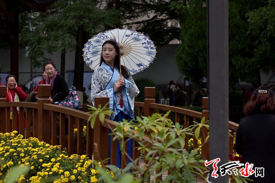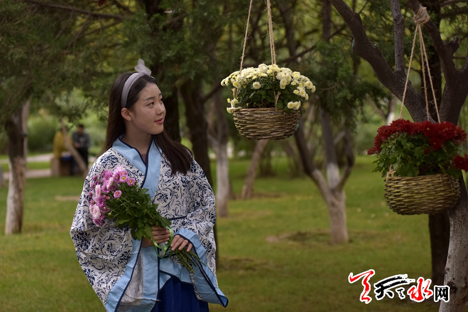 ????18日下午,人民公園里,賞客如織,川流不息,時有為一處拍照佳地排隊(duì)守候,或是快門按下的一瞬間,畫面里出現(xiàn)了“不速之客”,好不熱鬧。由恒順地產(chǎn)獨(dú)家贊助支持此次菊展,為增加此次菊展的文化品味和游園賞菊情趣,特別在展區(qū)內(nèi)增設(shè)了穿著漢服的模特,以渲染更加濃厚的文化氣息。
