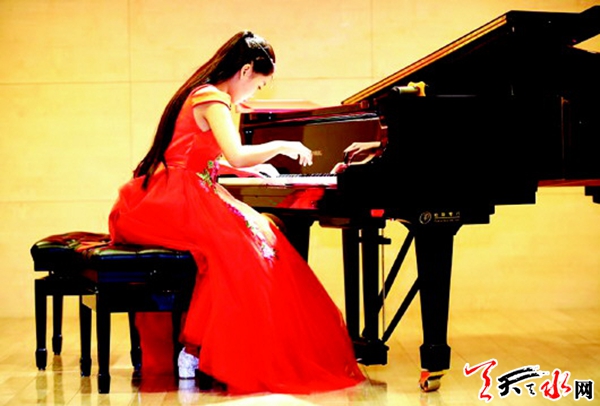 ???? 10月29日晚,深圳大劇院音樂(lè)廳燈光璀璨,如泉水般流淌跳躍的琴聲響徹人們的耳畔。誰(shuí)也沒(méi)想到,正在和意大利鋼琴家安東尼奧同臺(tái)演奏出這么優(yōu)美琴聲的紅裙女孩,竟是來(lái)自我市甘谷縣的12歲琴童張菁。