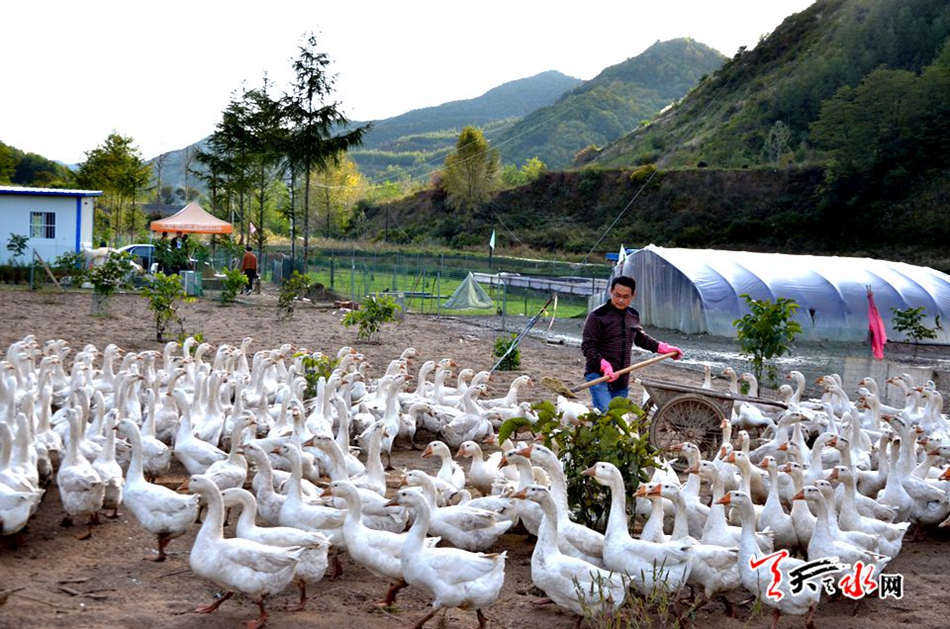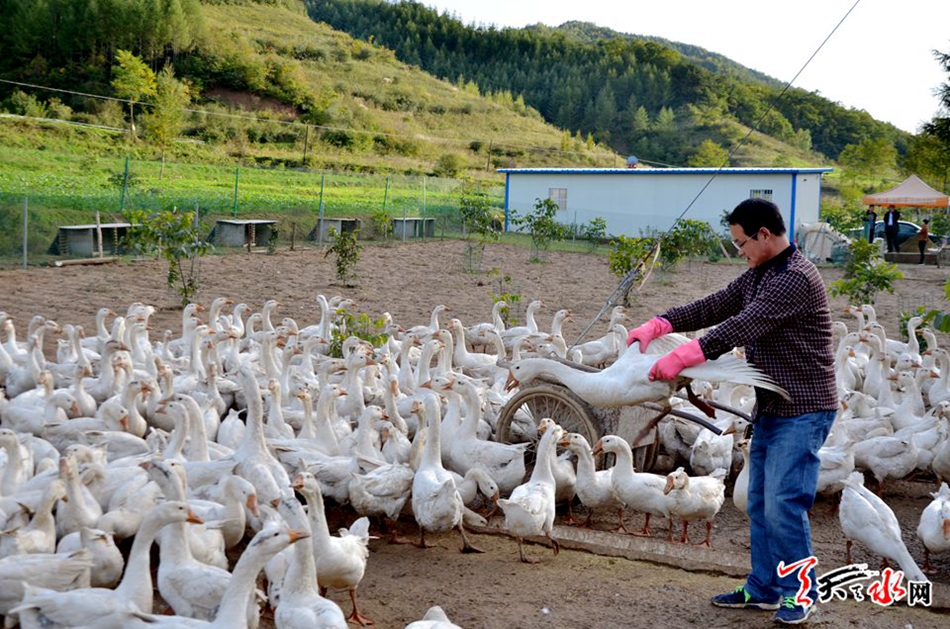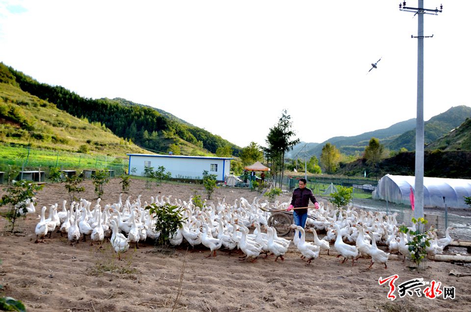 金秋十月,地處秦州區(qū)娘娘壩鎮(zhèn)的小南峪村被莽遠(yuǎn)的群山擁抱,在青山綠水環(huán)抱的一處平坦川道上,不時(shí)傳來(lái)鵝群引吭高歌的叫聲,循著聲音遠(yuǎn)望,成群成片的鵝群撲閃著翅膀,宛如翩翩起舞的蝴蝶在歡騰地嬉戲,這里正是自主創(chuàng)業(yè)人杜瑞春的養(yǎng)鵝基地。