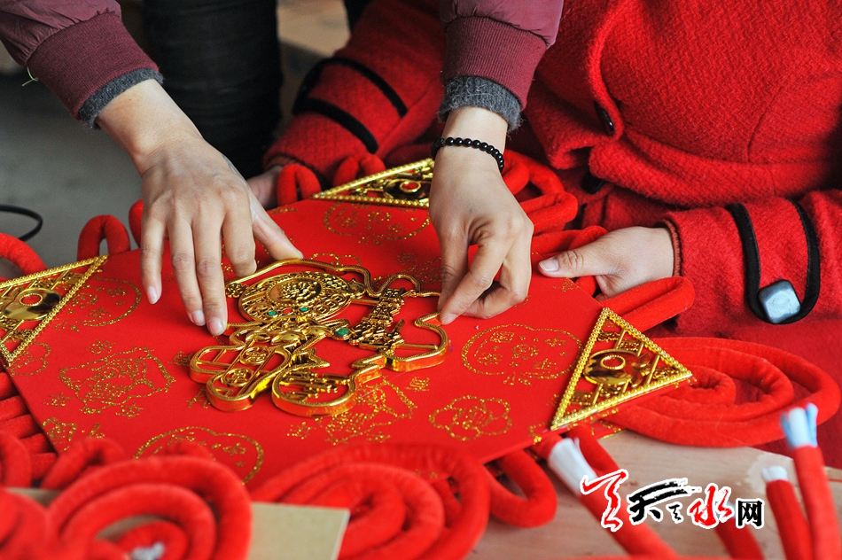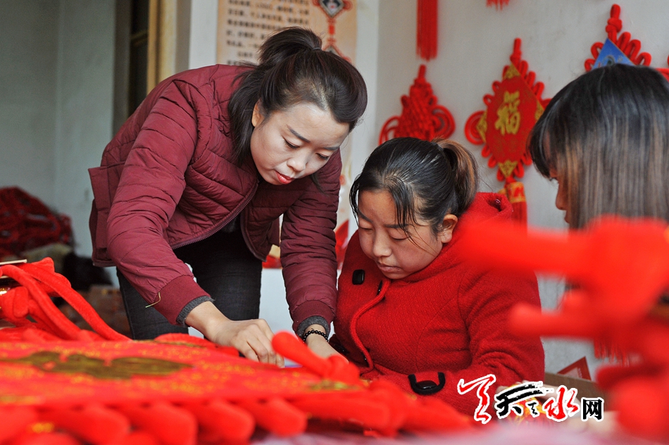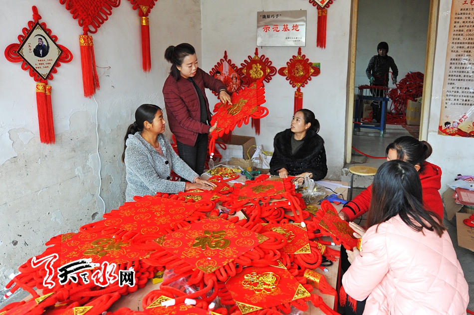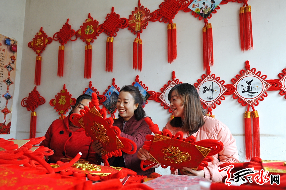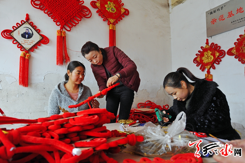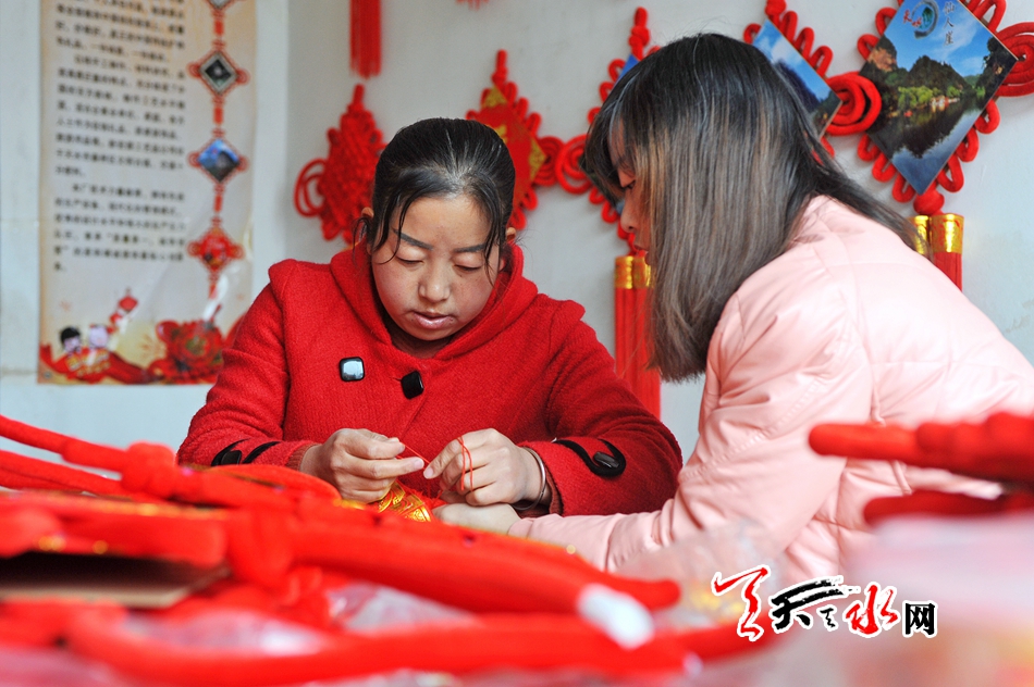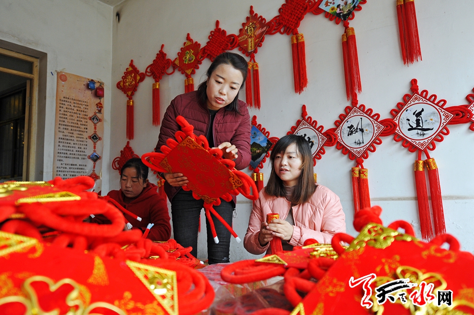 ????11月16日,秦州區(qū)藉口鎮(zhèn)不逢集,街上人也不多。臨街的一間鋪?zhàn)永飬s很熱鬧,也很喜慶。五六位年輕婦女圍坐在一起,正在編織中國結(jié)。掛滿紅色中國結(jié)的墻上,一塊牌子寫著“‘隴原巧手’示范基地”。