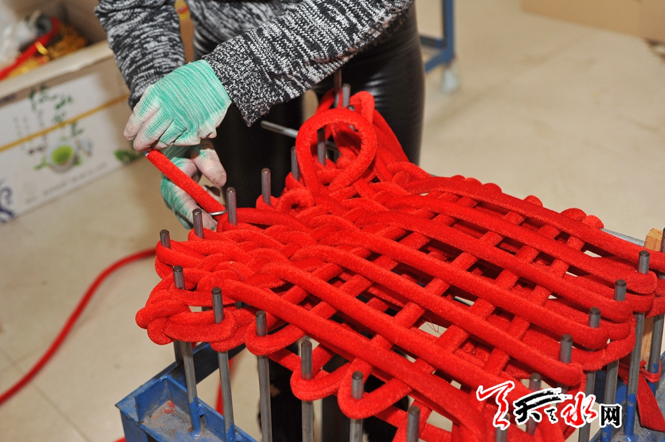 ????在鋼架上手工編織中國結(jié)。
