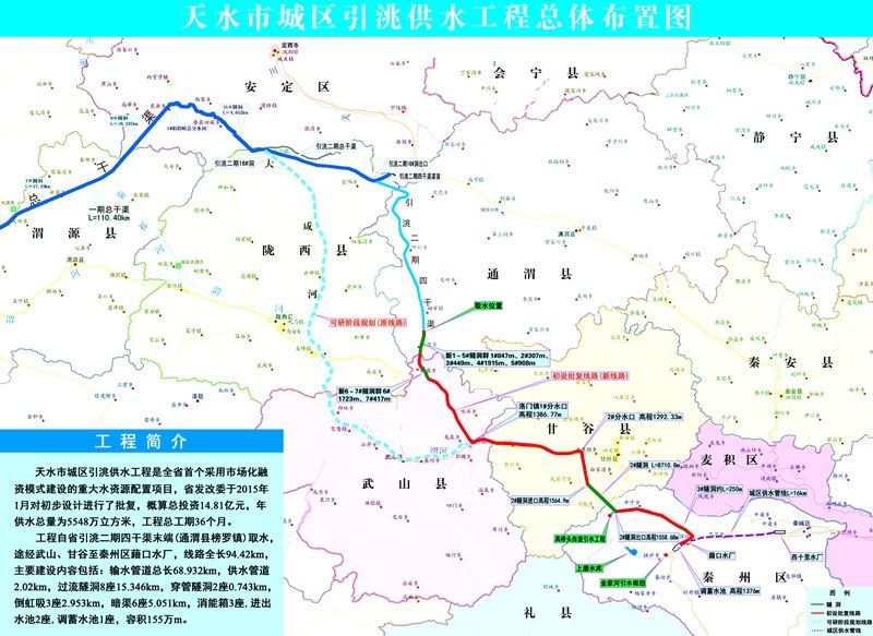 ????天水市城區(qū)引洮供水工程是近年來我市實施的最大的民生水利項目,項目工程投資19.12億元,于2014年8月9日正式開工建設(shè)。該工程自引洮二期四干渠末端(通渭縣榜羅鎮(zhèn))取水,途經(jīng)武山、甘谷進入秦州區(qū)關(guān)子鎮(zhèn)、藉口鎮(zhèn)至楊家灣調(diào)蓄水池到藉口水廠(距九甸峽水源樞紐277公里),經(jīng)城區(qū)供水管線進入西十里水廠供水至城區(qū)居民。項目建成通水后,可實現(xiàn)年供水量5548萬立方米,惠及秦州、麥積兩區(qū)的15個鄉(xiāng)鎮(zhèn)及街道80萬群眾,將從根本上解決當前天水城區(qū)水資源的供需矛盾。