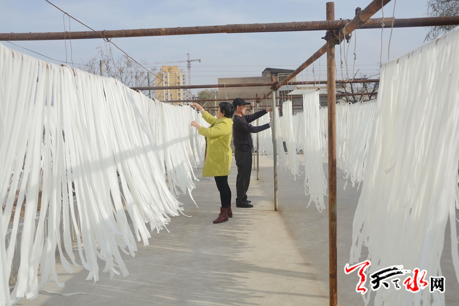 ??? 12月6日,武山縣城關(guān)鎮(zhèn)陳門村,村民王來全與妻子正站在屋頂?shù)钠脚_上,將粘連在一起的粉條一根一根地分開,然后再熟練地抖一抖讓它們晾曬得更加均勻。一排排剛制作出來的雪白色粉條在屋頂?shù)年柟庵须S風(fēng)柔軟地舞動。